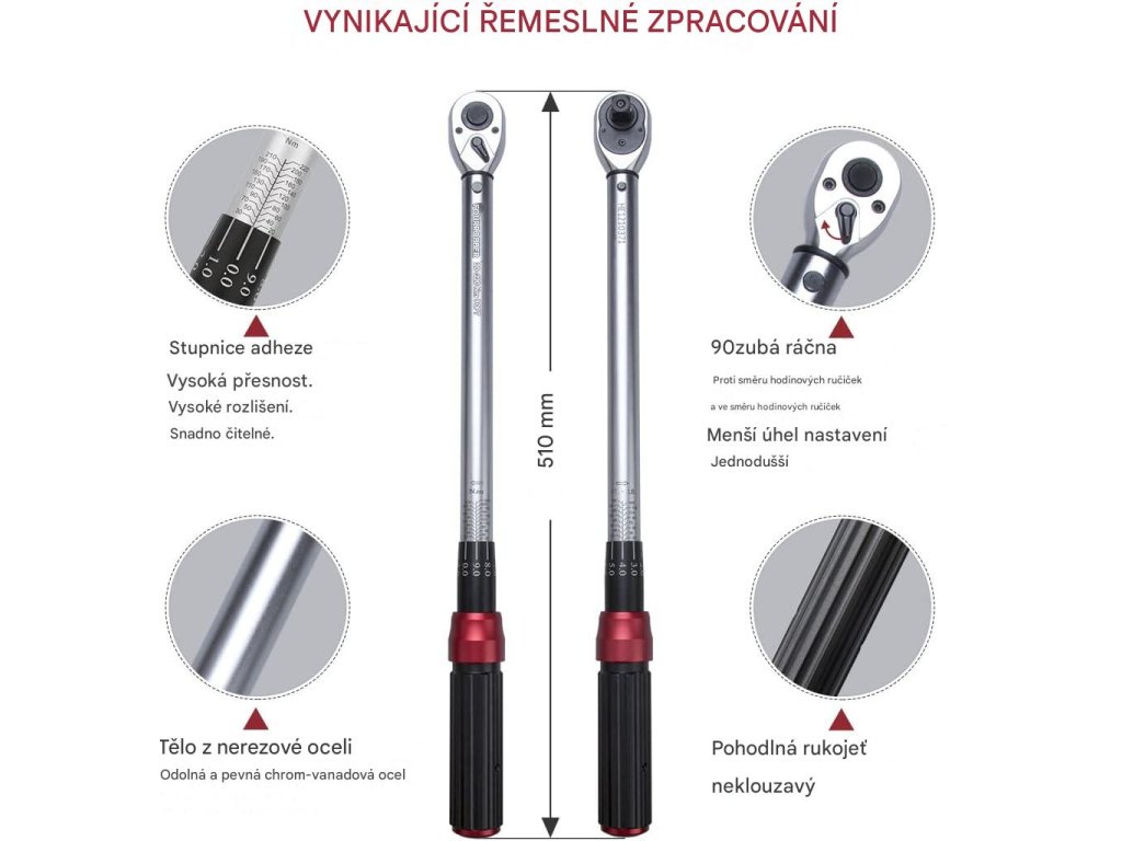 Momentové klíče jsou vyrobeny z masivní chrom-vanadové oceli s leštěným povrchem a ergonomickými rukojeťmi.
