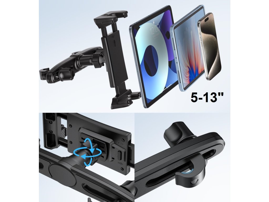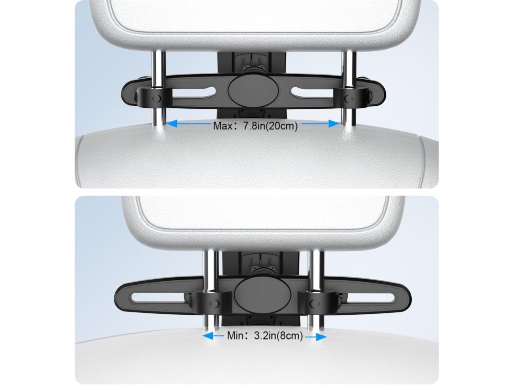 Držák na tablet do auta na hlavu je vhodný pouze pro 7–20 cm široké opěrky hlavy, kompatibilní se všemi zařízeními 5 až 13", jako iPad, Samsung Tablet, 2022 iPad Pro 11, iPad Pro 10.5, iPad Pro 10.2, iPad 9.7, 2022 iPad Air 5 4 3 2, iPad Mini 6 5 4 3 2 iPhone 16/15/14/13/12 Pro/Pro Max/ Plus/Mini, iPhone XS/XS Max/XR/X 8 7 6 6s Plus, Kindle, Fire, příslušenství, Samsung Tab, Switch, smartphony a další zařízení.