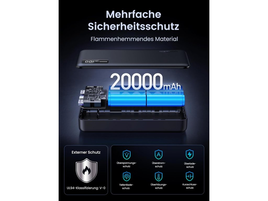 Powerbanka UGREEN nabízí rozsáhlou ochranu pro vaše přístroje, včetně přepěťové ochrany, ochrany proti zkratu, nadproudové ochrany a přehřátí.
