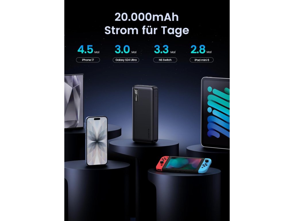 S enormní kapacitou baterie 20 000 mAh a stabilní výdrží baterie můžete svůj iPhone 15 Pro nabít 4,5krát, Galaxy S24 Ultra 3,0krát, NS Switch 3,3krát a iPad Mini 2,8krát, ...