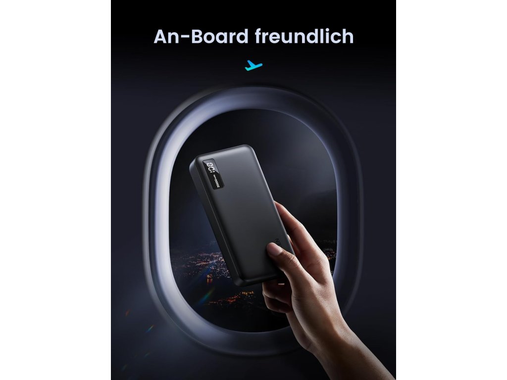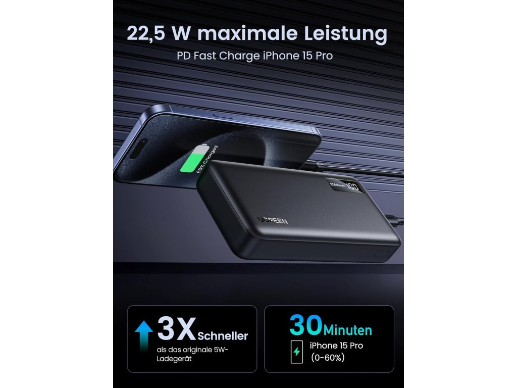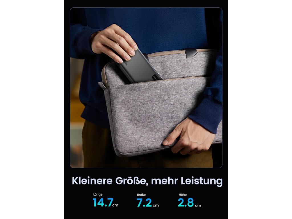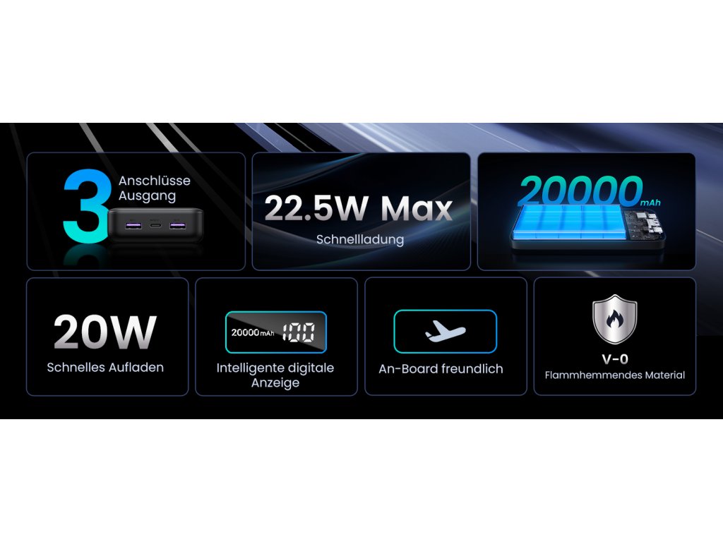 S výkonem 22,5 W a vysokorychlostním USB výstupem je tento externí akumulátor pro mobilní telefon optimální na cesty.