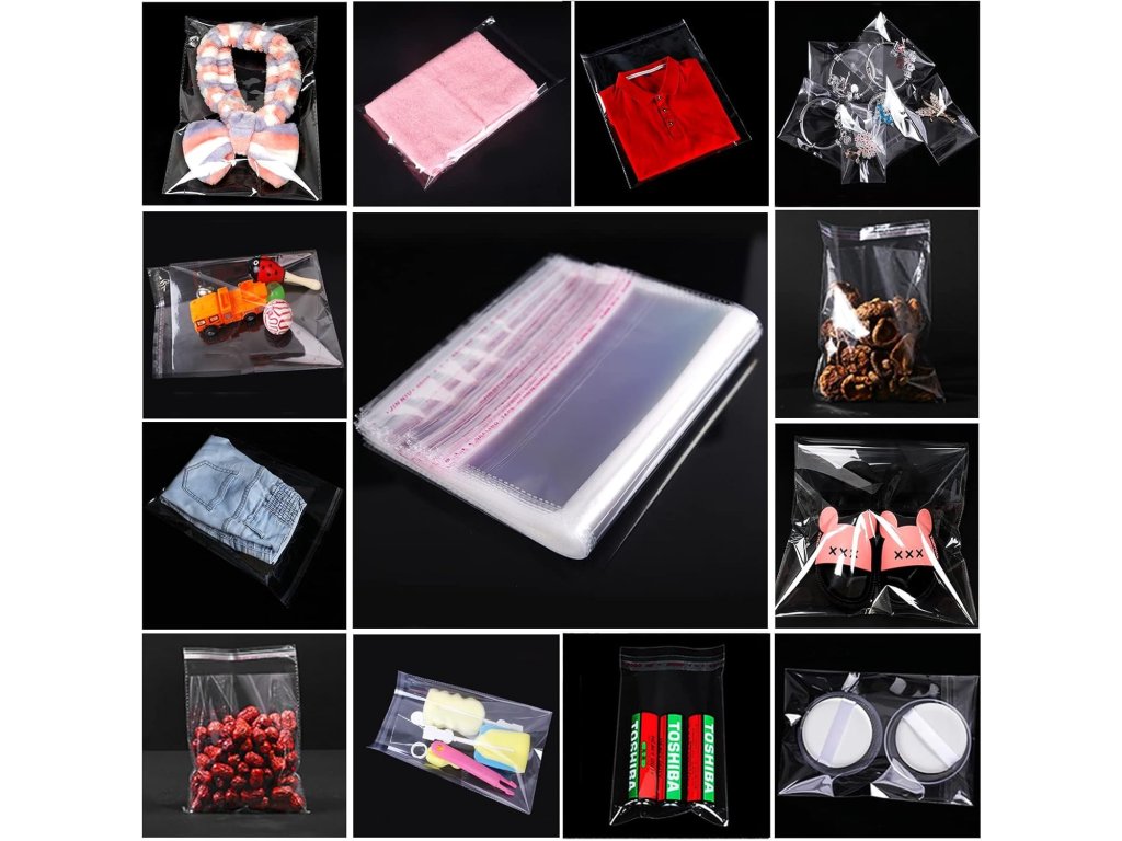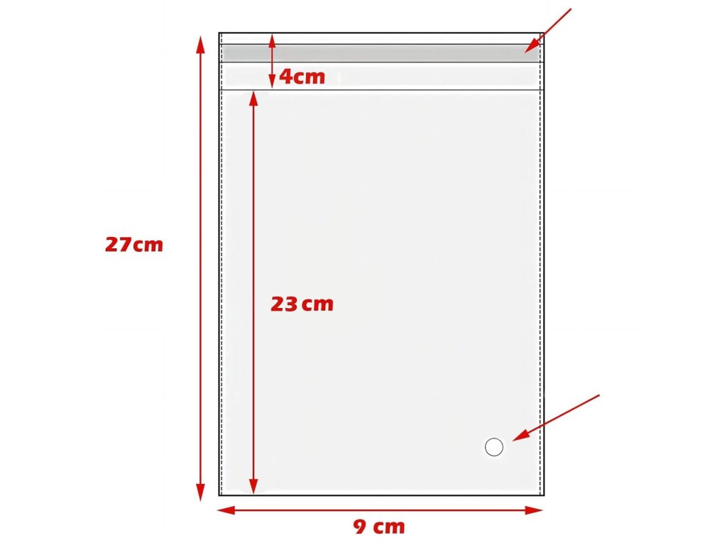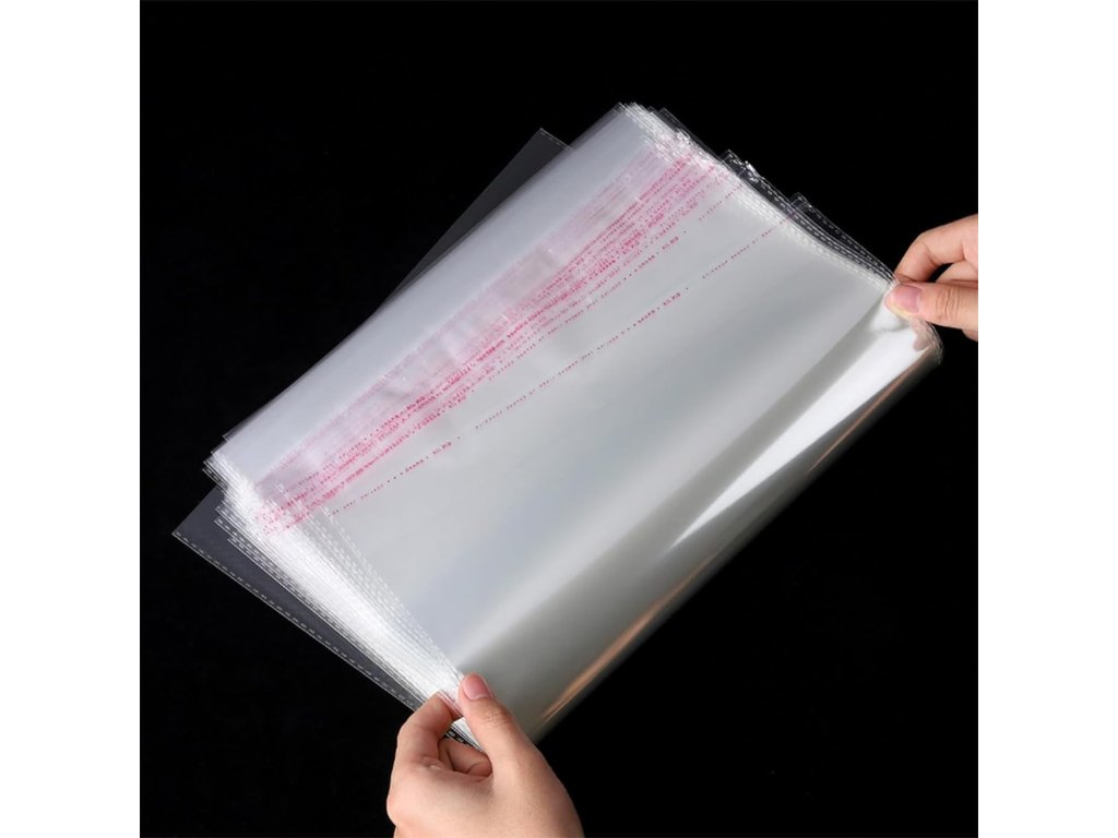 Transparentní balicí sáčky jsou vyrobeny z kvalitního OPP, s velikostí sáčků 9 x 23 + 4 cm a tloušťkou 70 μm (zalepená velikost činí 9 x 23 cm).