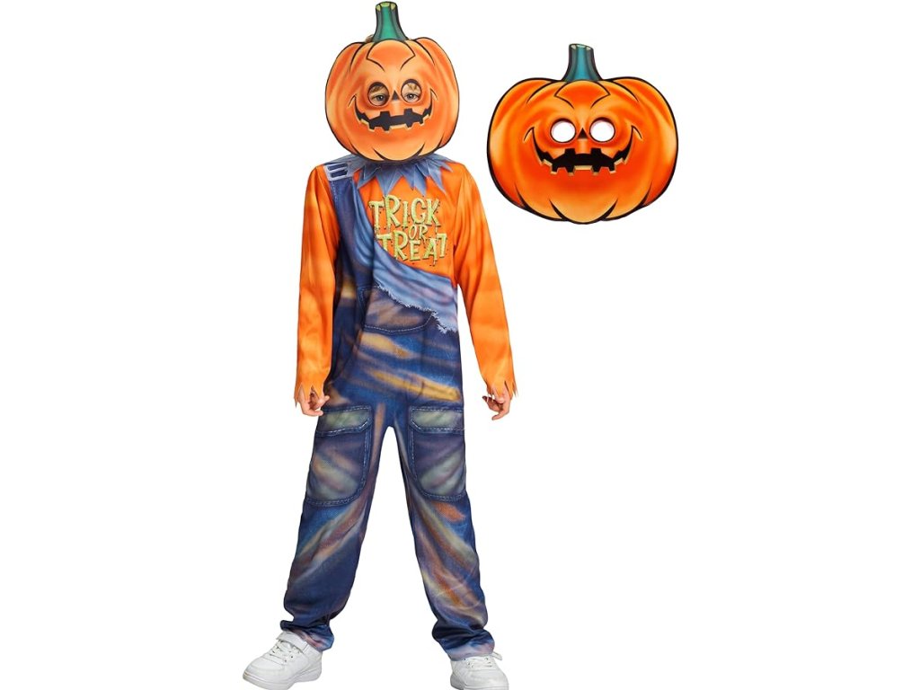 Dětský dýňový kostým, Halloween strašák s dýňovou maskou, vel. 128