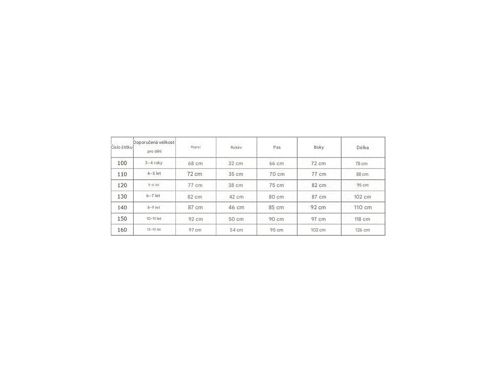 100: Doporučená velikost pro děti 3-4 roky, hrudník 68 cm, rukáv 32 cm, pas 66 cm, boky 72 cm, délka 78 cm.