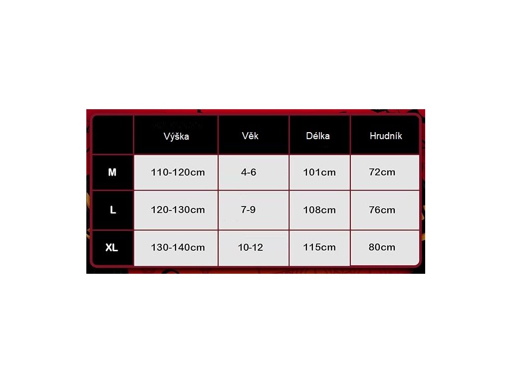 Dětský kostým je vyroben z kvalitní polyesterové tkaniny, která je pohodlná a prodyšná, měkká a šetrná k pokožce a nevybledne.