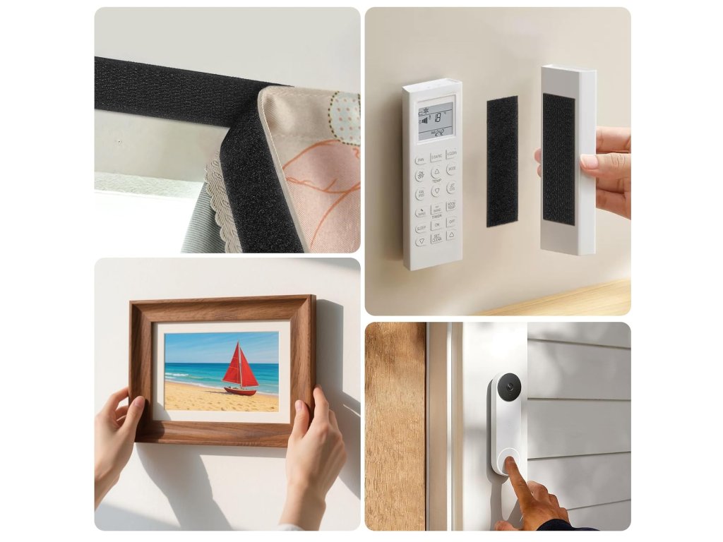 Perfektní pro lehčí předměty, lze jej použít k zajištění dálkových ovladačů, upevnění držáků závěsů, váz, zásuvkových lišt, světel skříně, koberců, polštářů na pohovku, nášivek, papírů, pedagogických tisků, atd.