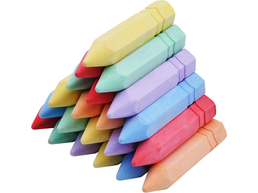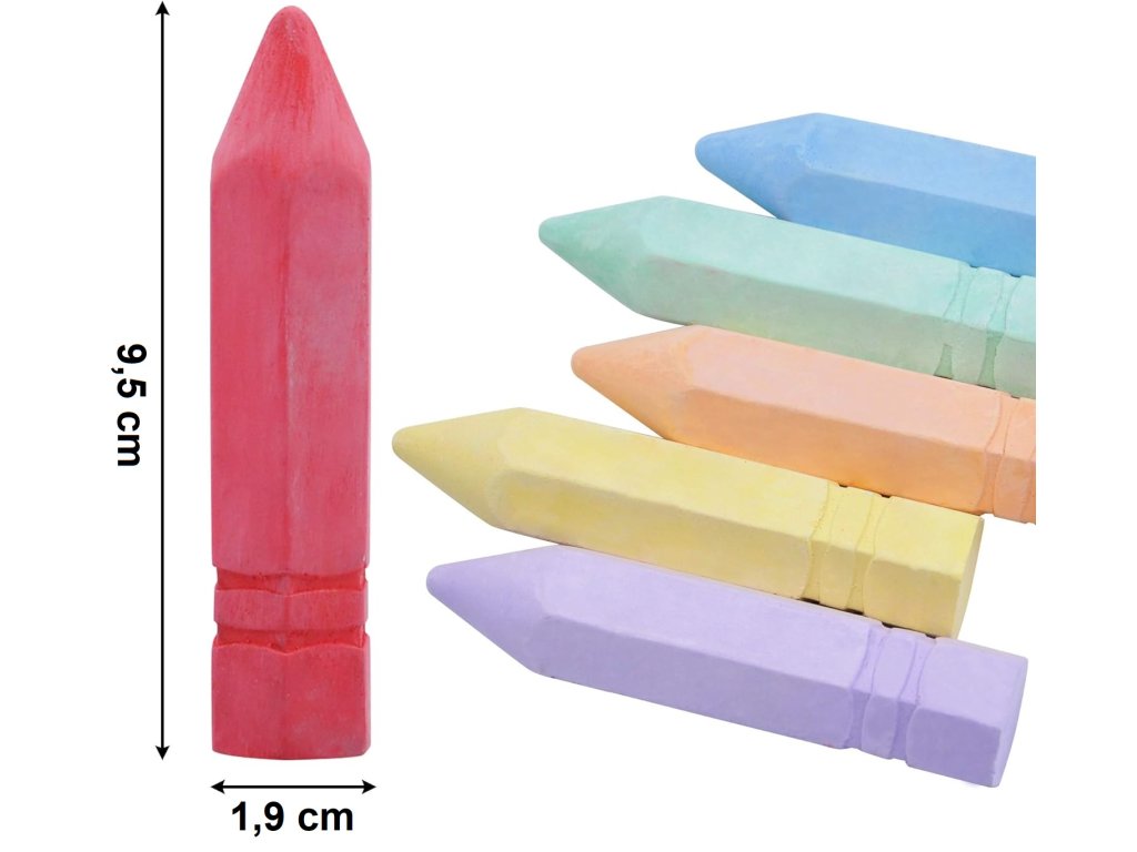 Křídy Outdoor Craft Play obsahují 24 kuželovitých bezprašných kříd v 6 barvách (modrá, zelená, červená, oranžová, žlutá a fialová).