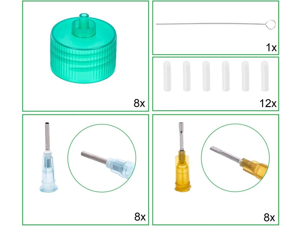 37x sada přesných krytek aplikátoru (8 čepiček aplikátoru, 1 kulatou jehlu, 16 plochých jehel a 12 silikonových jehliček, celkem 37 dílů.)