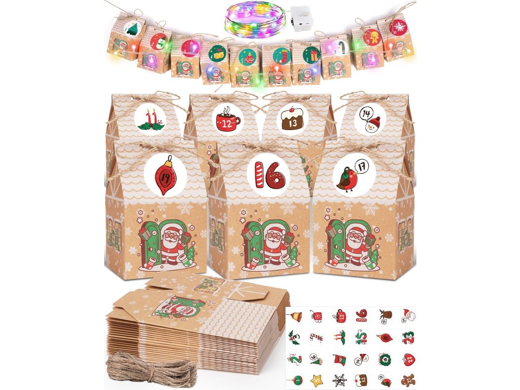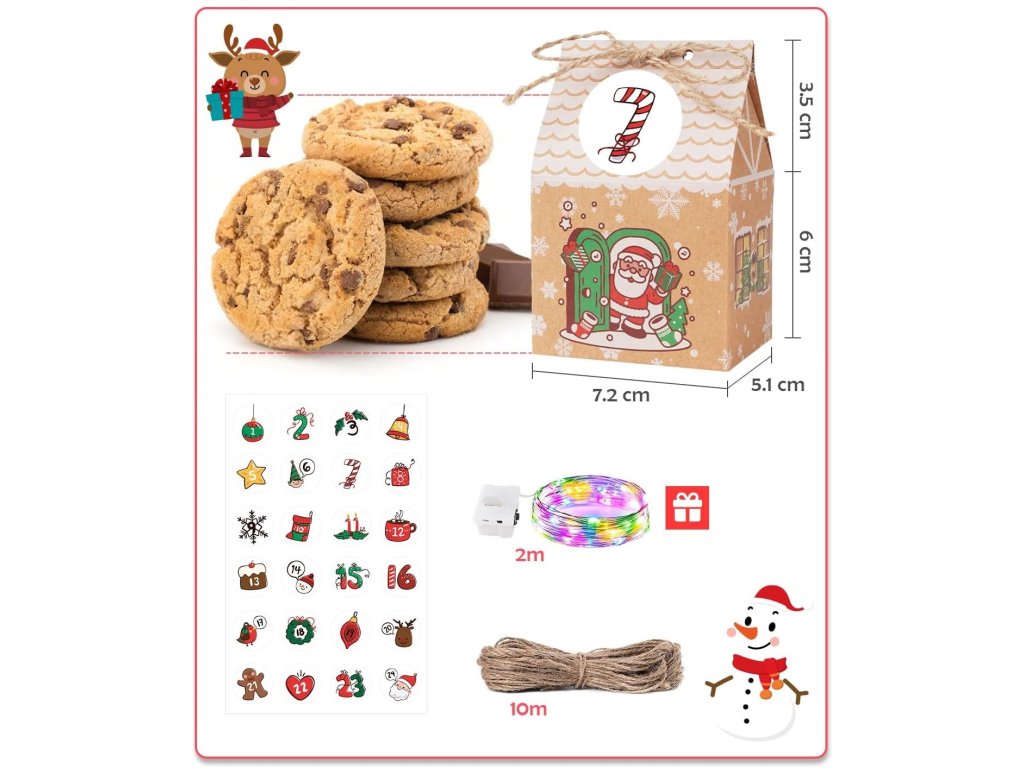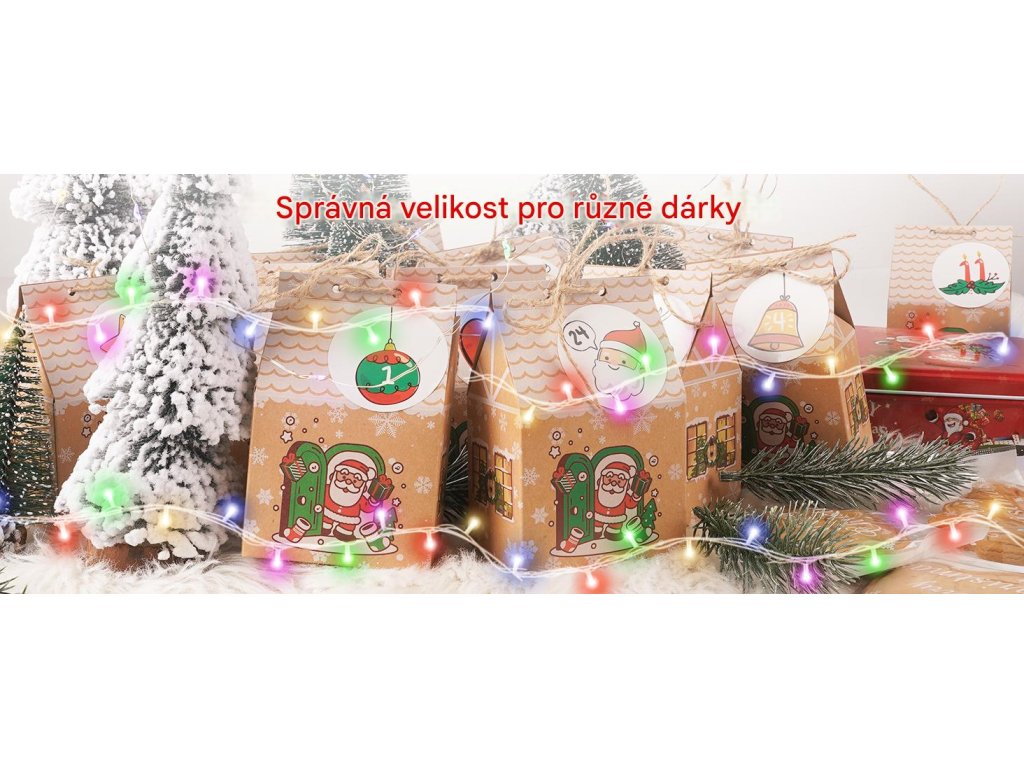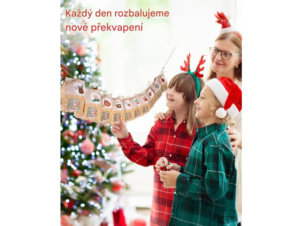 24 sáčků je potištěno 12 různými motivy, 2m světelný řetěz, 1 list samolepky, 10m jutová šňůrka pro posílení slavnostní atmosféry.