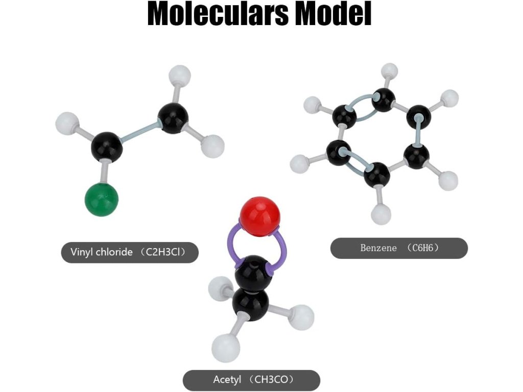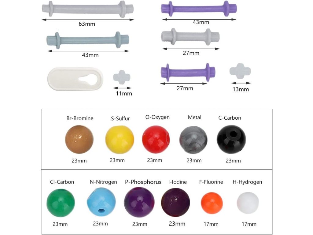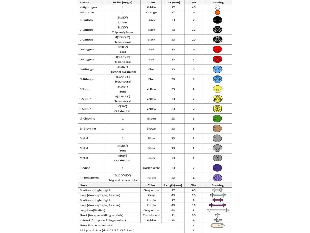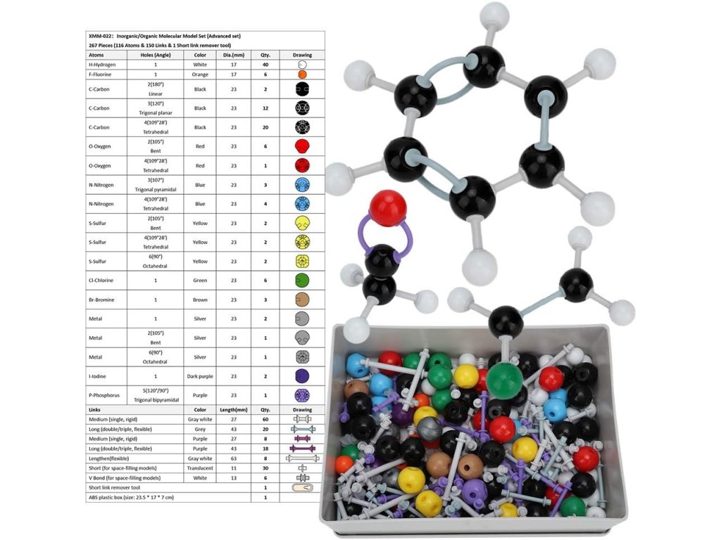 Sada pro chemické modely obsahuje 116 atomů, 150 spojů a spojovací nástroj, který studentům nabízí vizuální, praktické zkušenosti pro výuku chemických molekulárních struktur.