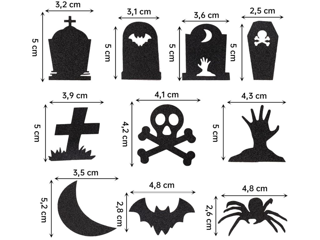 Obdržíte 100 ks konfet Halloween. Součástí je 10 motivů, jako jsou netopýři, pavouci, duchové, náhrobní kámen, lebka atd., které v kombinaci s klasickým černým designem vytvářejí strašidelnou atmosféru.