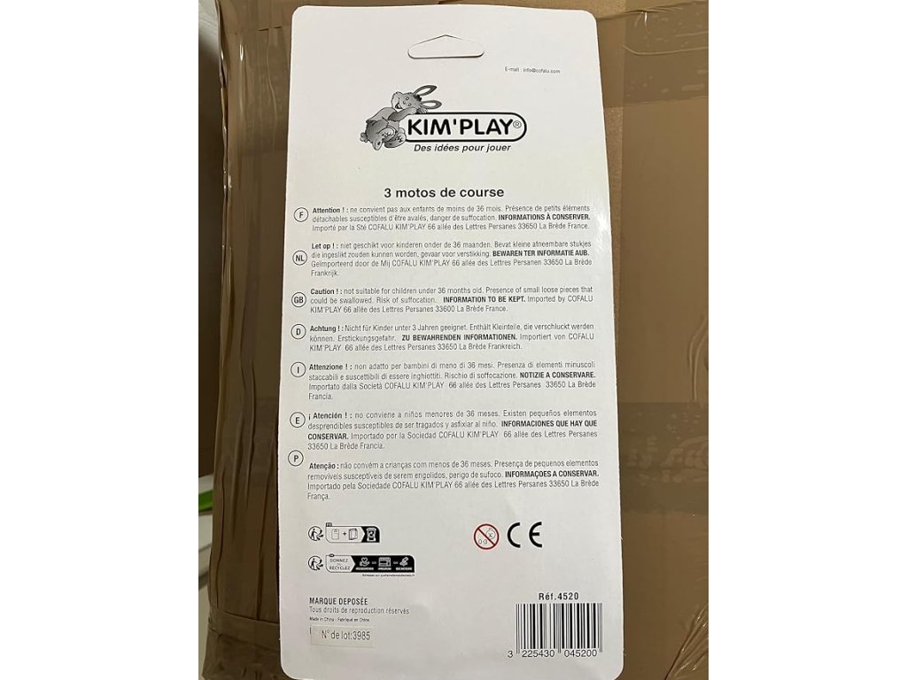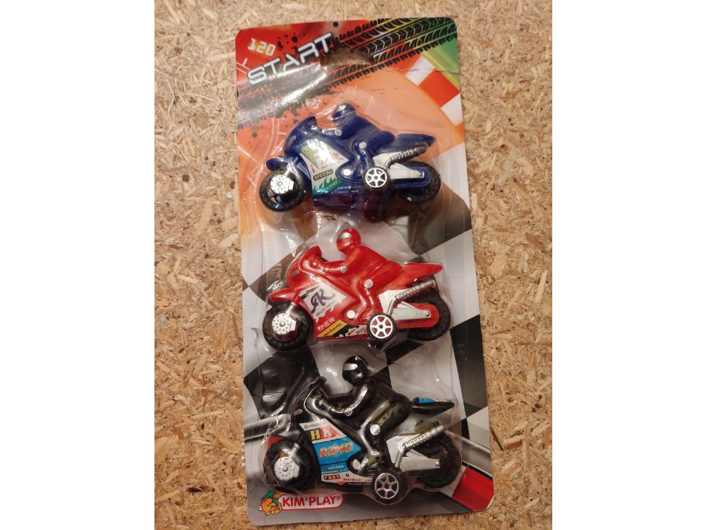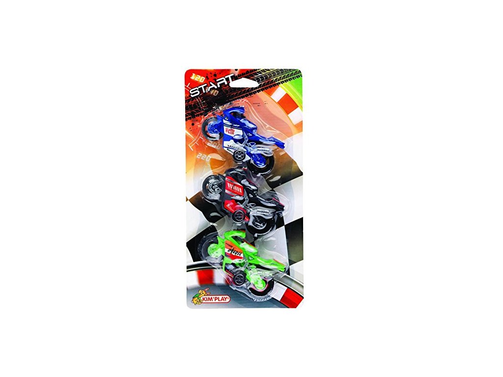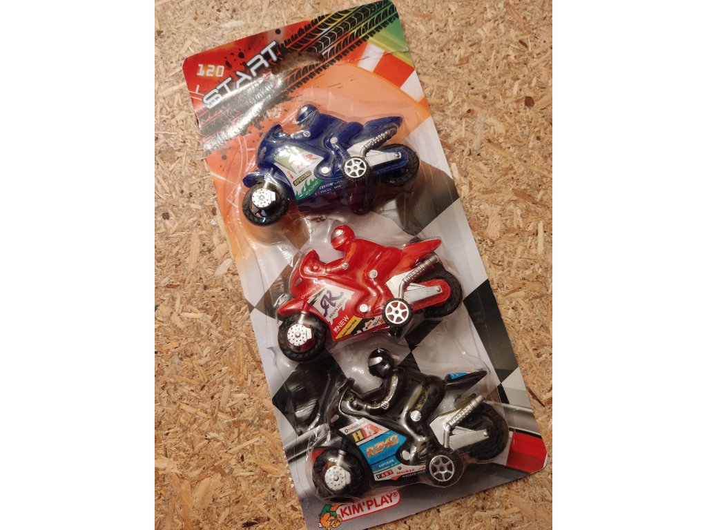 Rozpruďte dětskou fantazii s tímto blistrovým balením od Kim Play: tři barevné mini závodní motorky (červená, modrá a černá) vyrobené z odolného plastu, ideální pro simulaci napínavých závodů nebo doplnění sbírky miniatur.