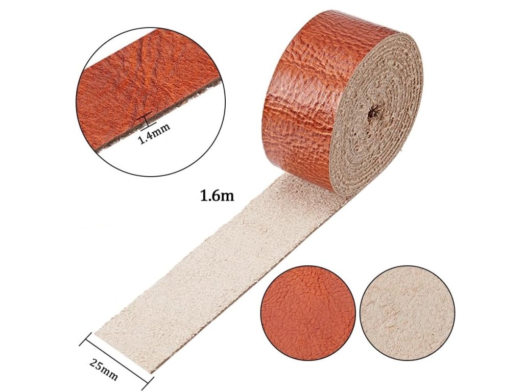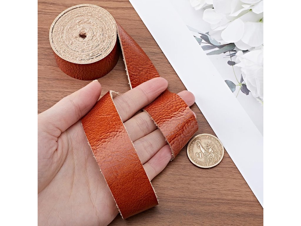 Plochý řemínek z pravé kůže v kokosově hnědé barvě je přibližně 25 mm široký, 1 mm silný a 1,6 m dlouhý, což stačí k uspokojení vašich různých kutilských potřeb.