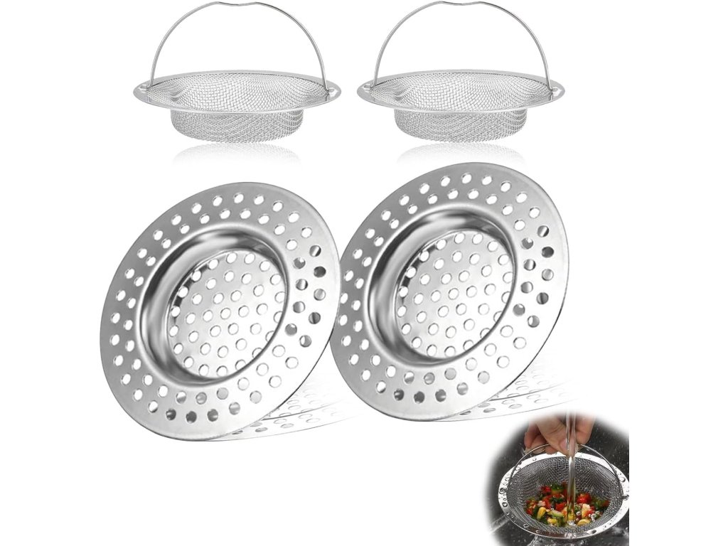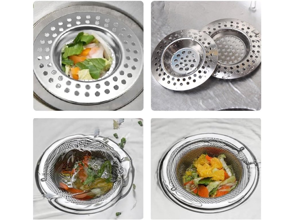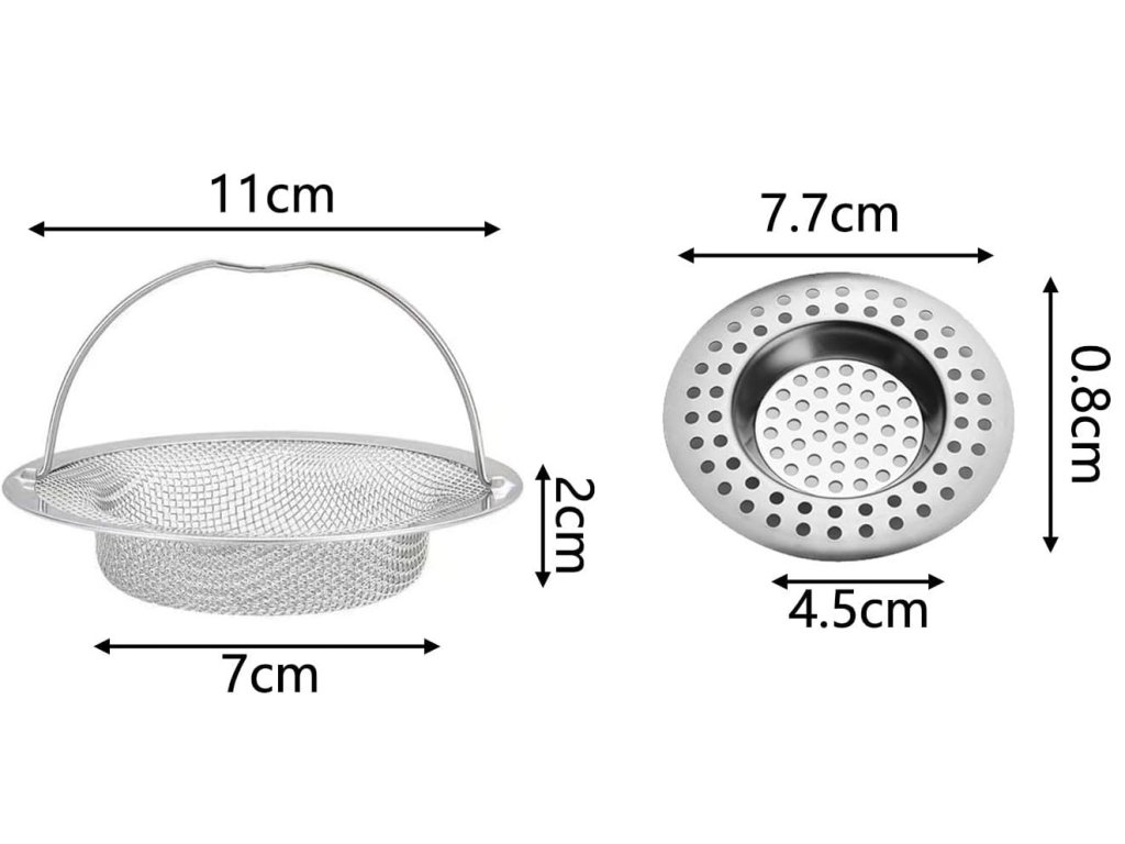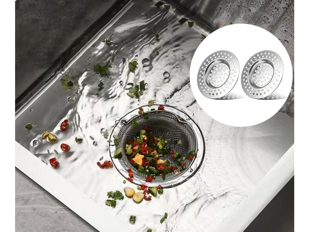 2 kusy nerezových sít do odpadu. Otvory s vysokou hustotou o průměru 1 mm umožňují rychlý průchod vody a zároveň účinně blokují částice jídla.