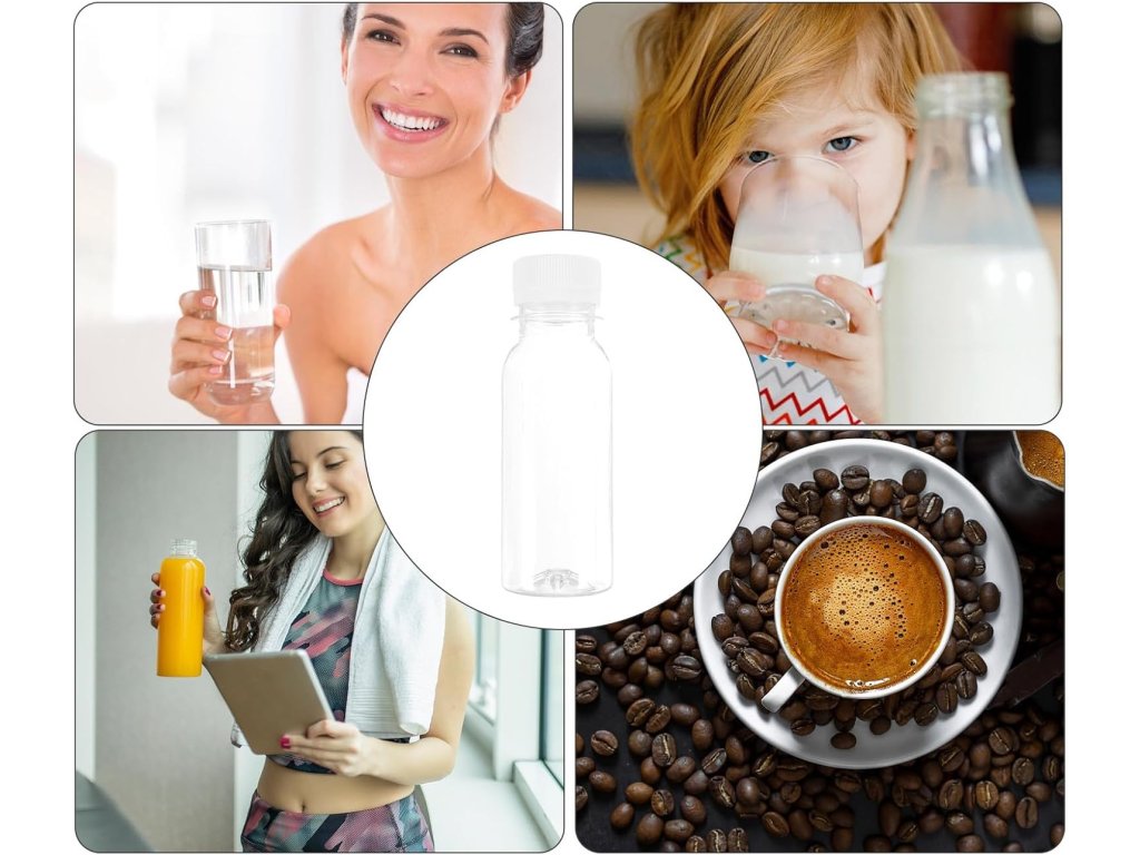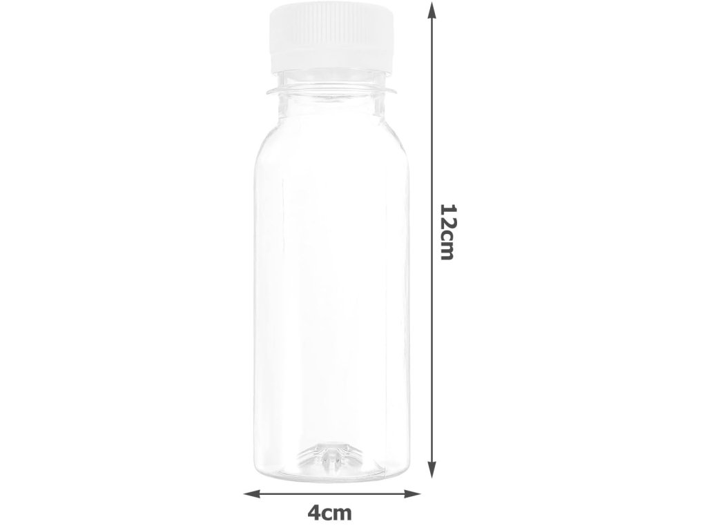 Balení obsahuje 10 průhledných plastových lahví na pití s víčky, každá o objemu 100 ml. Jsou velmi lehké a přenosné.
