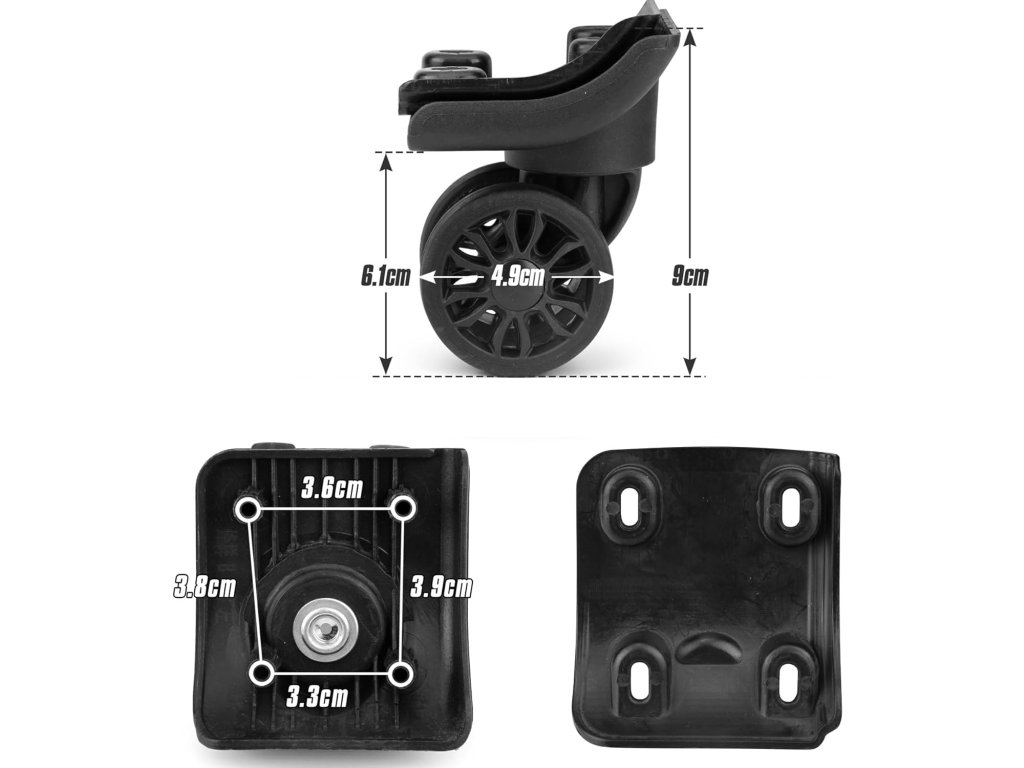 Kola mají průměr 55 mm, vnější průměr osy kola zavazadla je 2,5 cm, vhodný k opravě většiny dvojitých kol zavazadel.