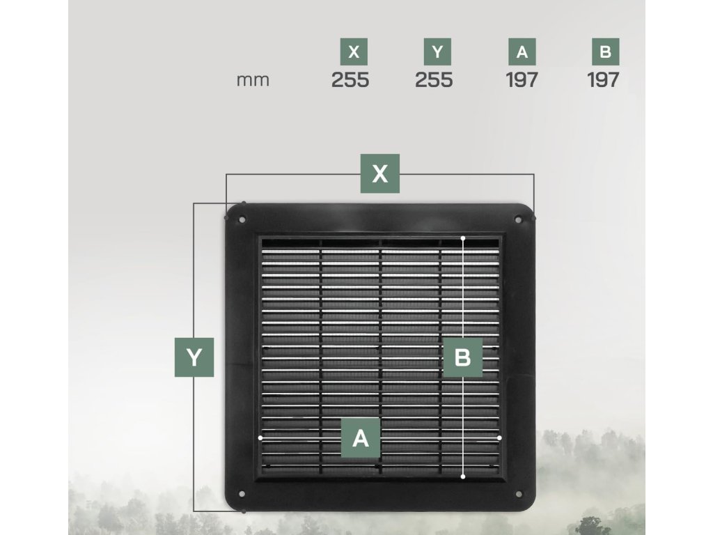 Vnější rozměry jsou 250 x 250 mm - rozměry otvoru mřížky jsou 200 x 200 mm.
