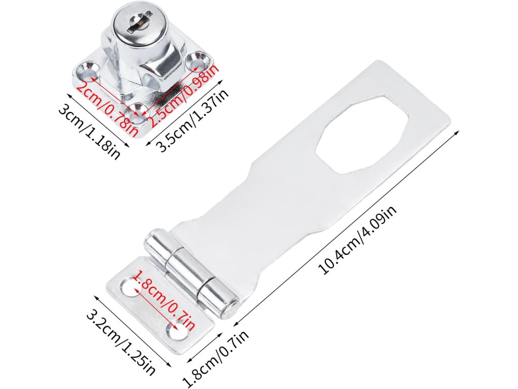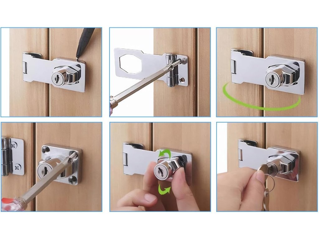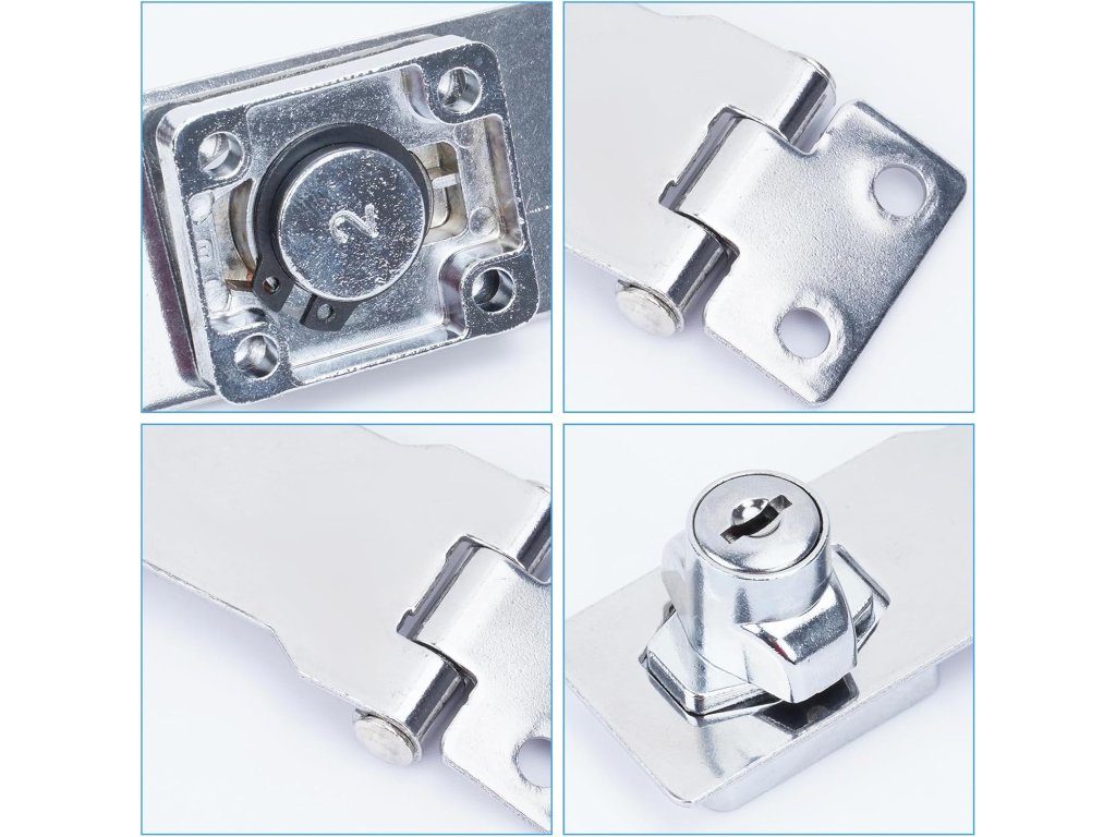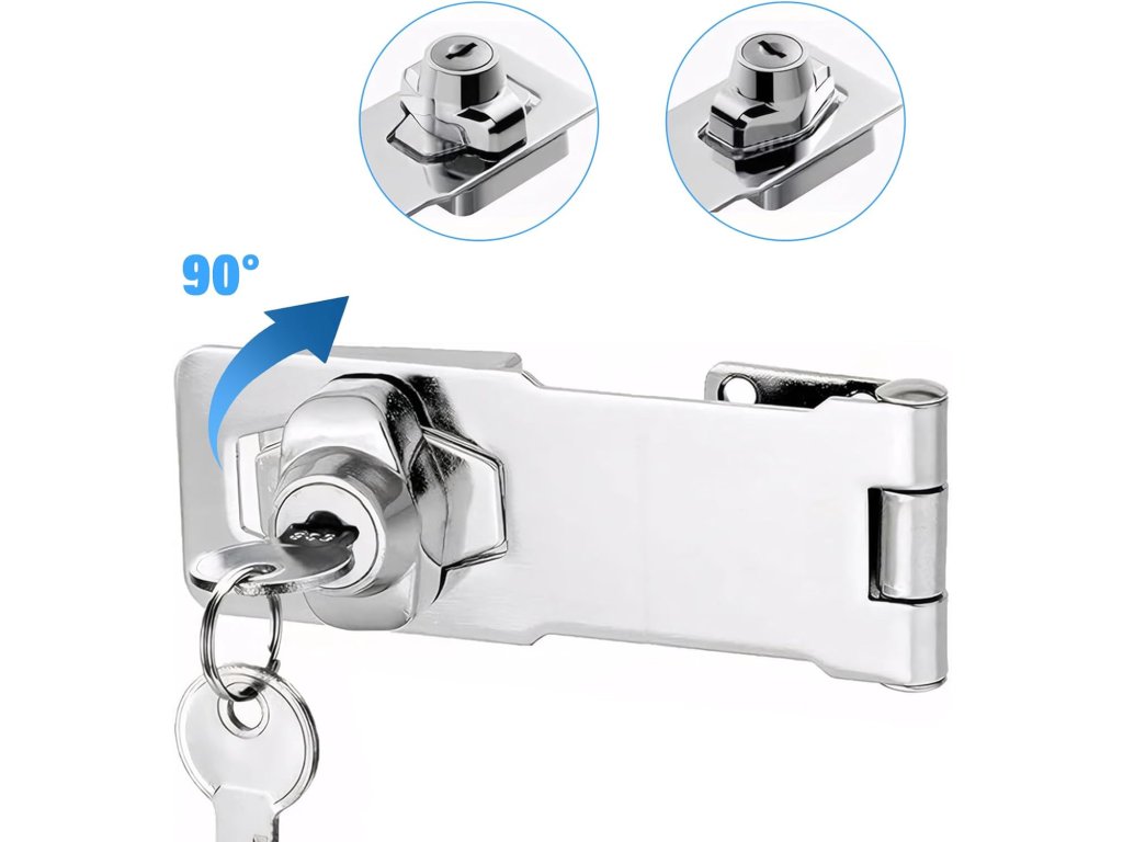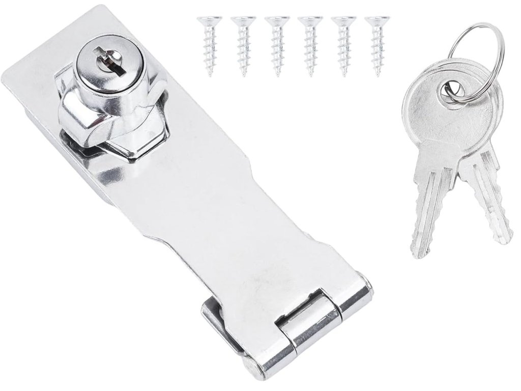 Sada obsahuje praktický automatický zámek, petlici, 2 klíče a 6 šroubů, vše, co potřebujete pro bezpečnou instalaci.