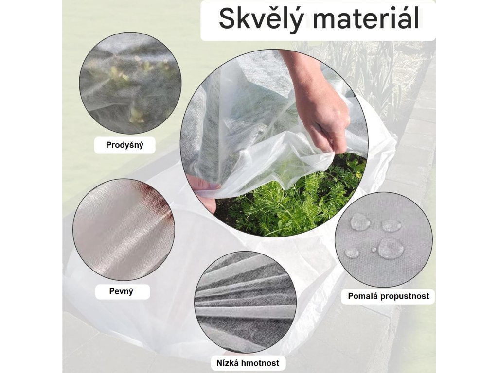 Kryt na rostliny je vyroben z netkané textilie o gramáži 40 g/m² s vysokou pevností v tahu a odolností proti roztržení.