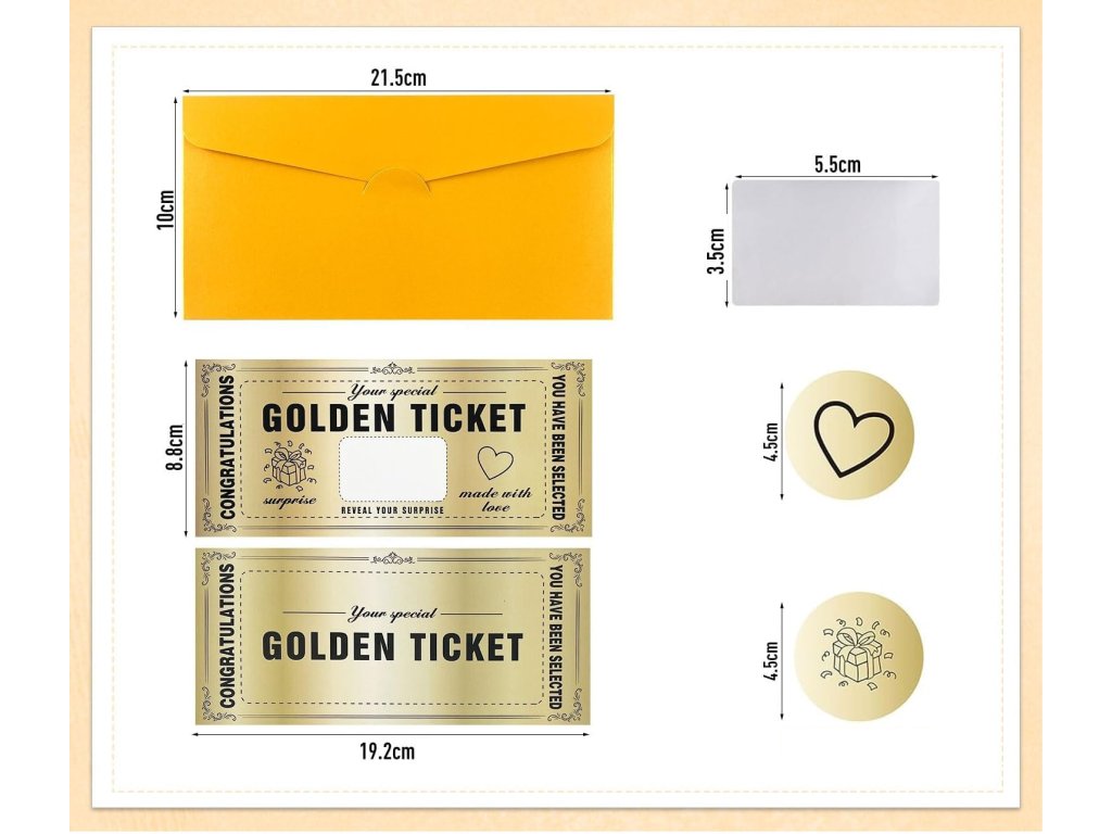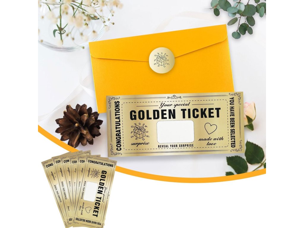 Dárková sada s překvapením obsahuje 15 exkluzivně vytvořených stírací kartiček Golden Ticket, 15 obálek a 15 stíracích nálepek. Vše, co potřebujete, abyste vytvořili vzrušující překvapení, je obsaženo v praktickém balení.