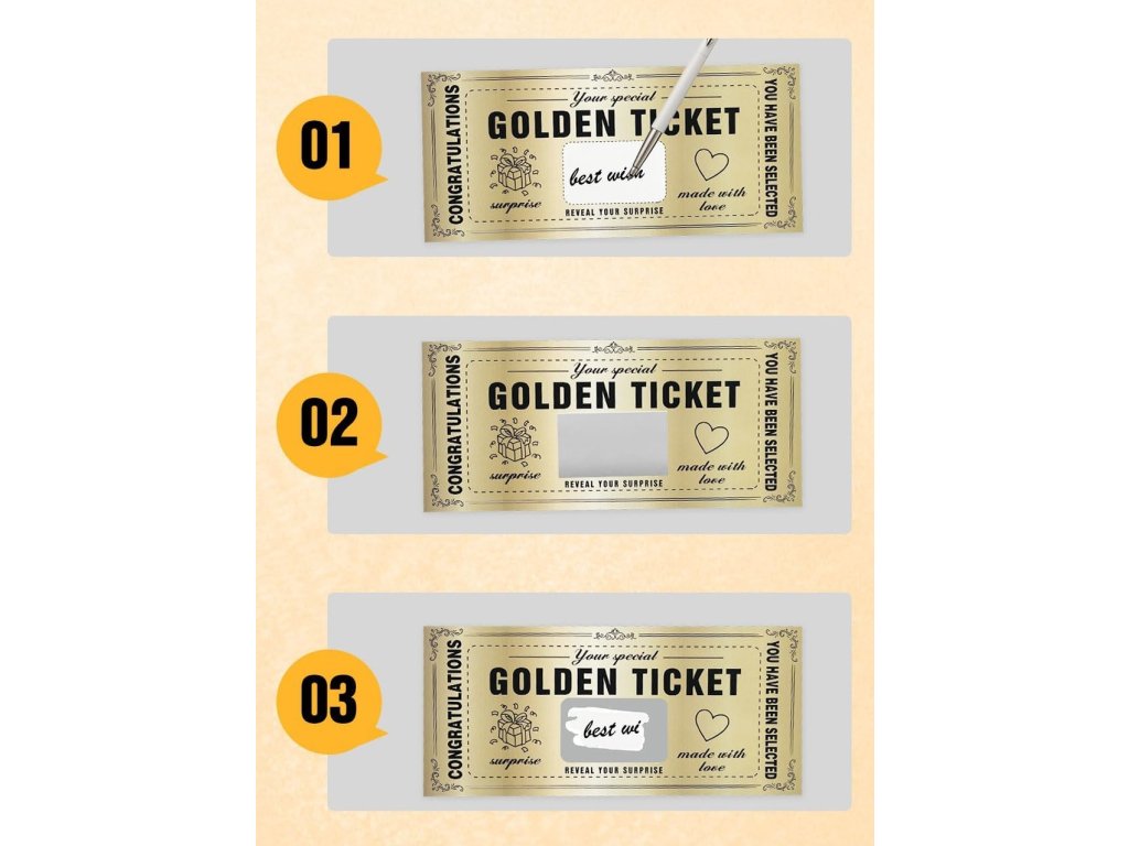 Zlaté stírací karty jsou vyrobeny z odolného papíru, který je příjemný na dotek. Stírací nálepky lze snadno připevnit a odstranit, aniž by došlo k poškození karty.