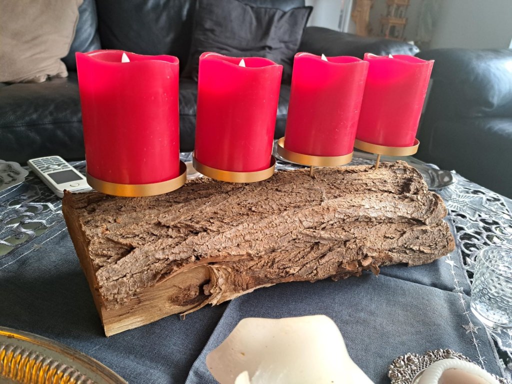 Adventní svícny nejsou jen pro věnce, ale také pro hoblované dřevo nebo dřevěný kmen jako stolní dekorace, pro malé vázy, nebo pro podnosy.