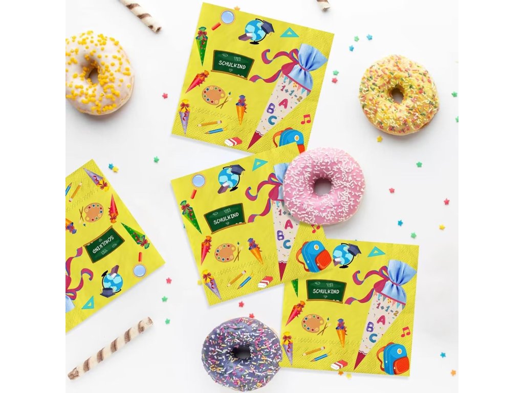 Dekorace na první školní den - 40ks ubrousky žluté (3vrstvé) + 6 listů školních samolepek
