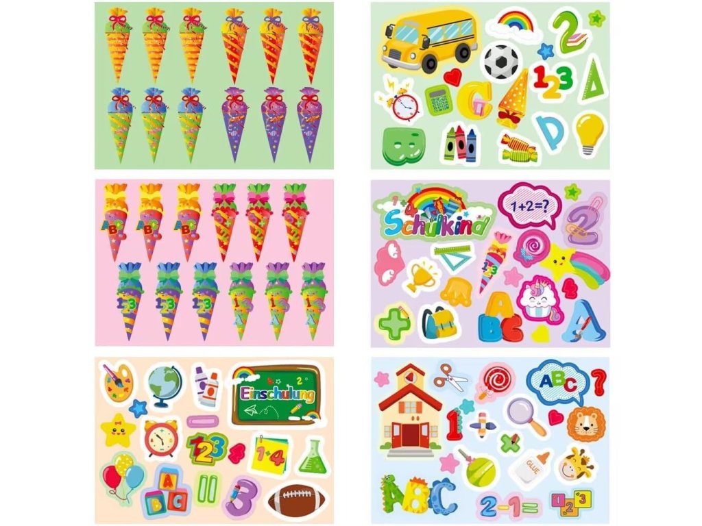 Dostanete 6 listů (20 × 14 cm) samolepek na školní potřeby pro děti, včetně cukrových kornoutů, ABC, 123, školní aktovky, knihy, pravítka, atd.