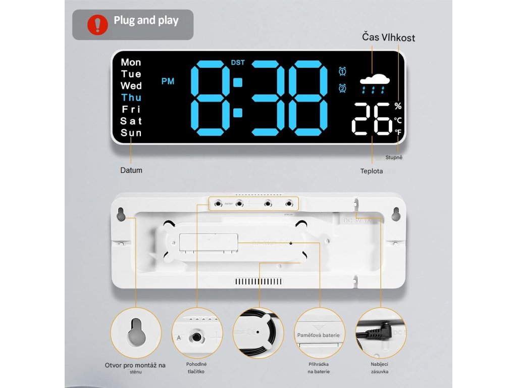 Hodiny nejen ukazují přesný čas, ale také den v týdnu, aktuální teplotu a vlhkost prostředí. Všechny tyto informace jsou přehledně zobrazeny na jednom displeji.