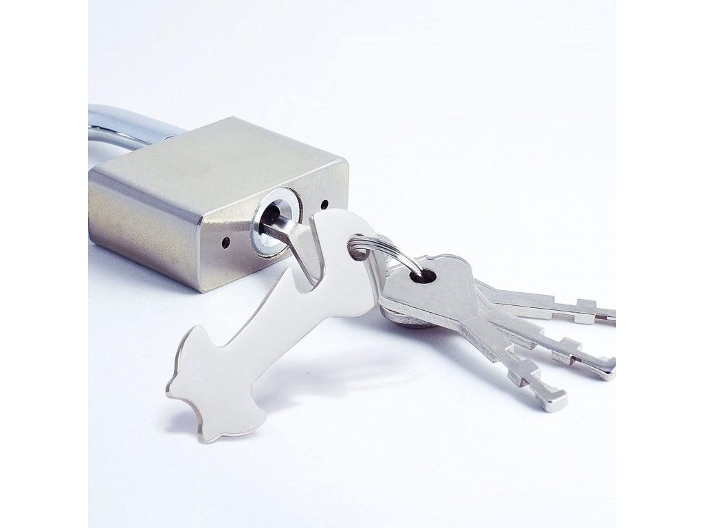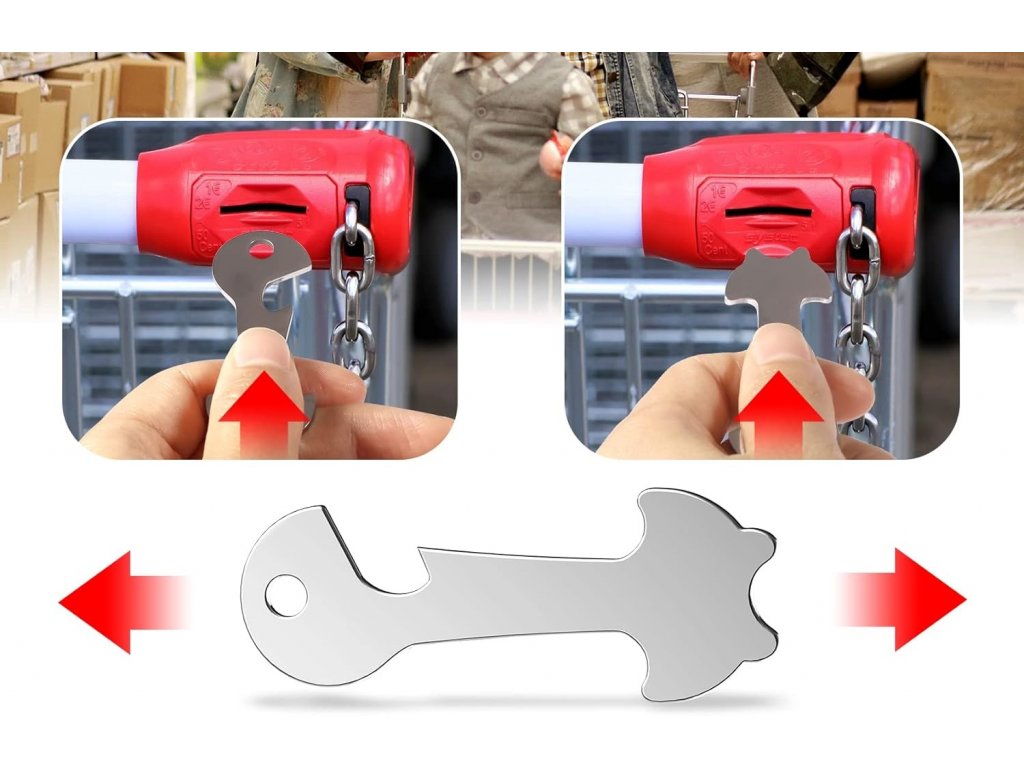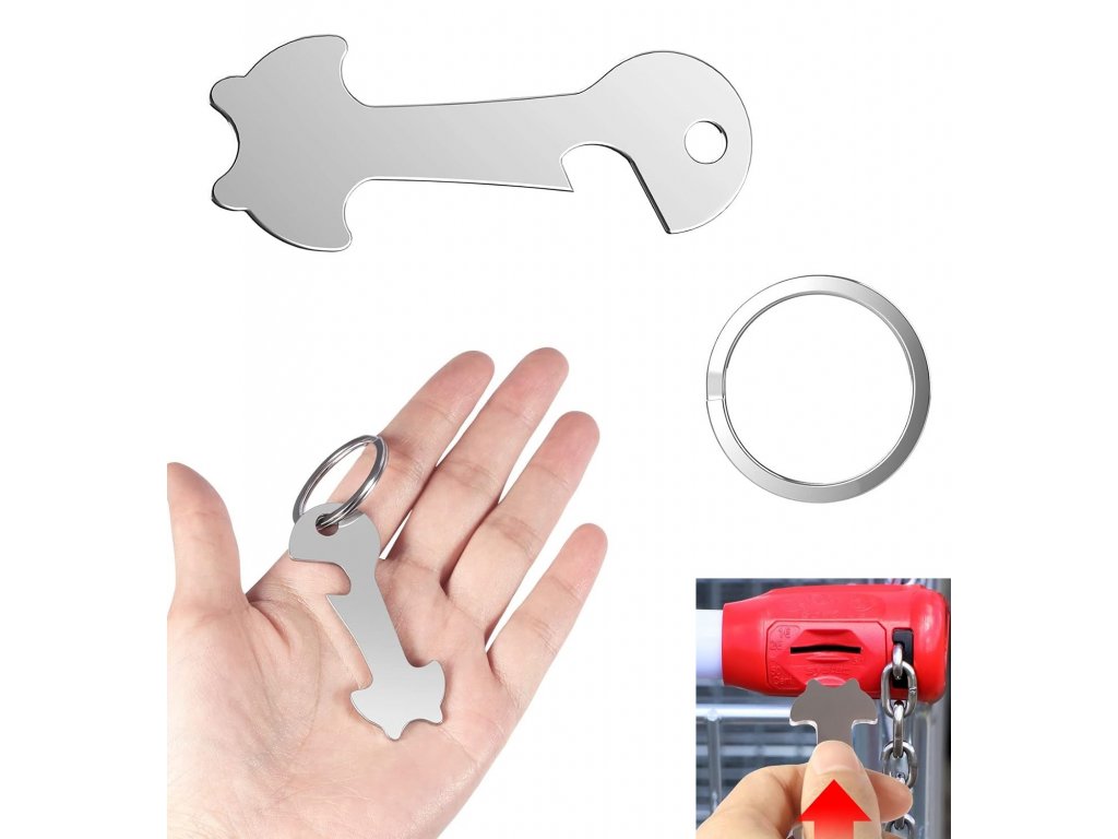 Víceúčelový přívěsek na klíče. Oba konce přívěsku na klíče slouží pro snadné otevření nákupního košíku a lze je použít také jako otvírák na láhve.