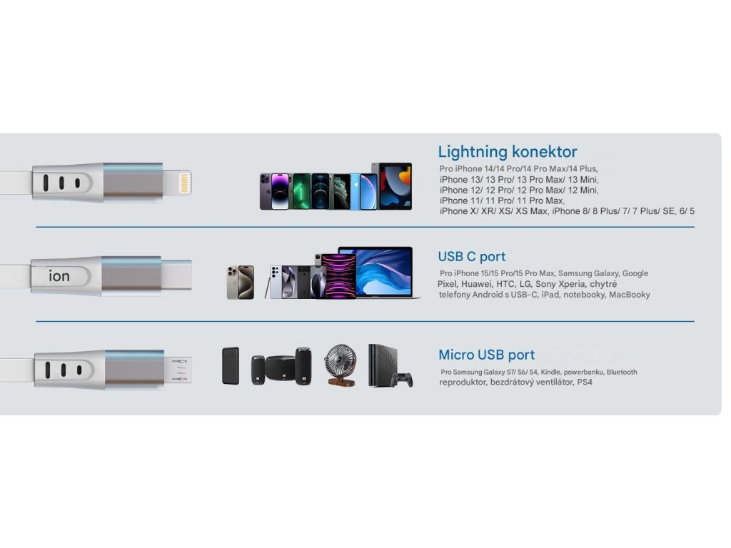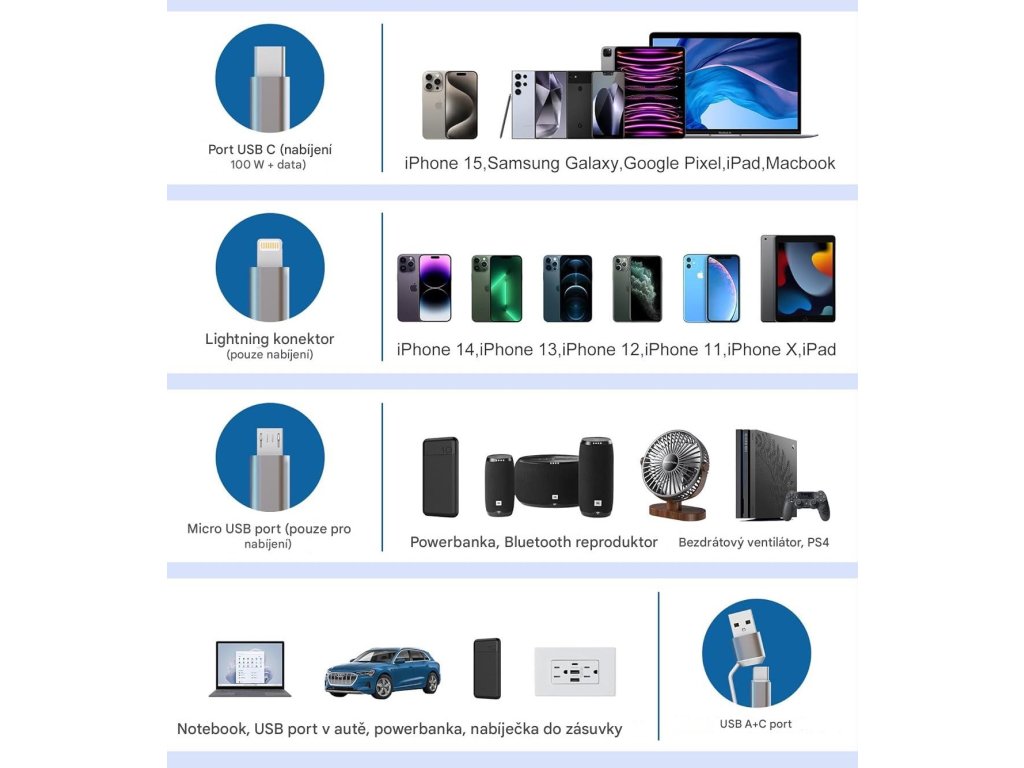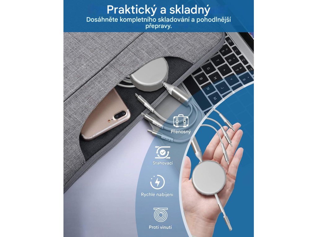 Zatahovací nabíjecí kabel USB-C podporuje 100W rychlé nabíjení, nabíjecí kabel Lightning podporuje 27 W rychlé nabíjení a Micro-USB je 10 W, pro všechny přístroje Android a Apple.