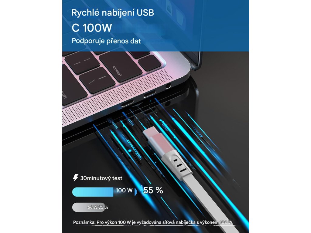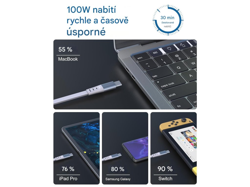 Kabel USB A na USB C a kabel USB C na USB C podporují 100 W rychlé nabíjení a rychlost nabíjení se zvýší o 60 % (musí se používat s 100W nabíječkou).