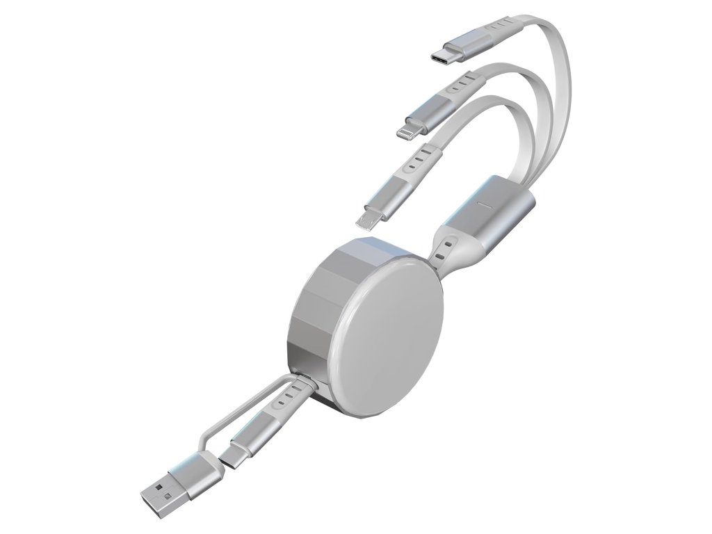 Výsuvný multi USB nabíjecí kabel s konektory Lightning, USB C a Micro-USB.