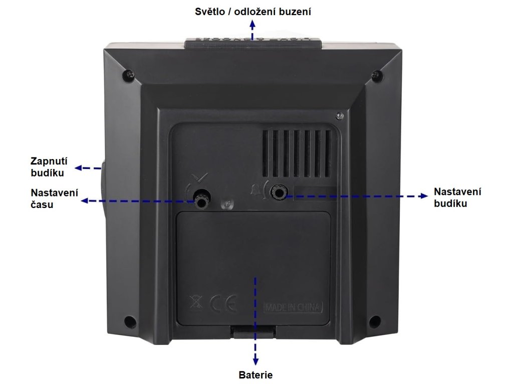 Velká obrazovka s vysokým rozlišením a tučné písmo poskytují širší a jasnější pohled. Odložení buzení po 5 minutách. Nastavitelný jas displeje. Provoz na AAA baterie.