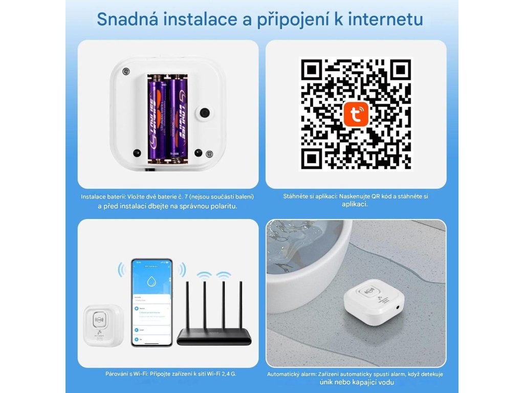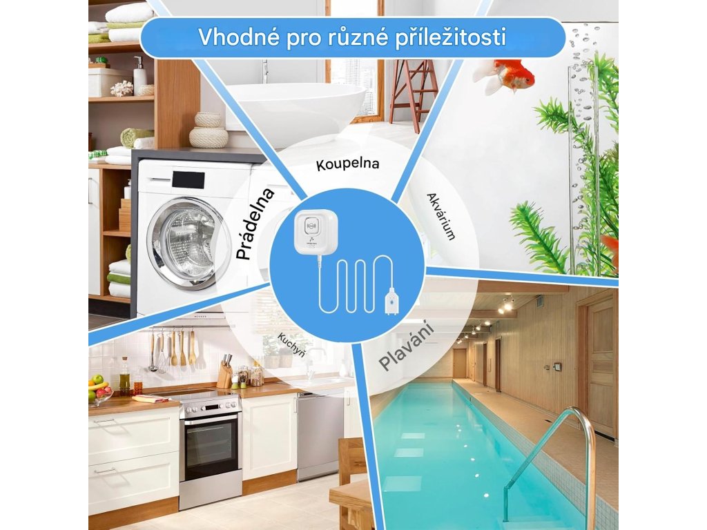 Vodní senzor WiFi lze umístit všude tam, kde by se mohl objevit únik vody nebo je třeba hlídat hladina, a jeho tón alarmu je dostatečně hlasitý, aby pronikl do místností.