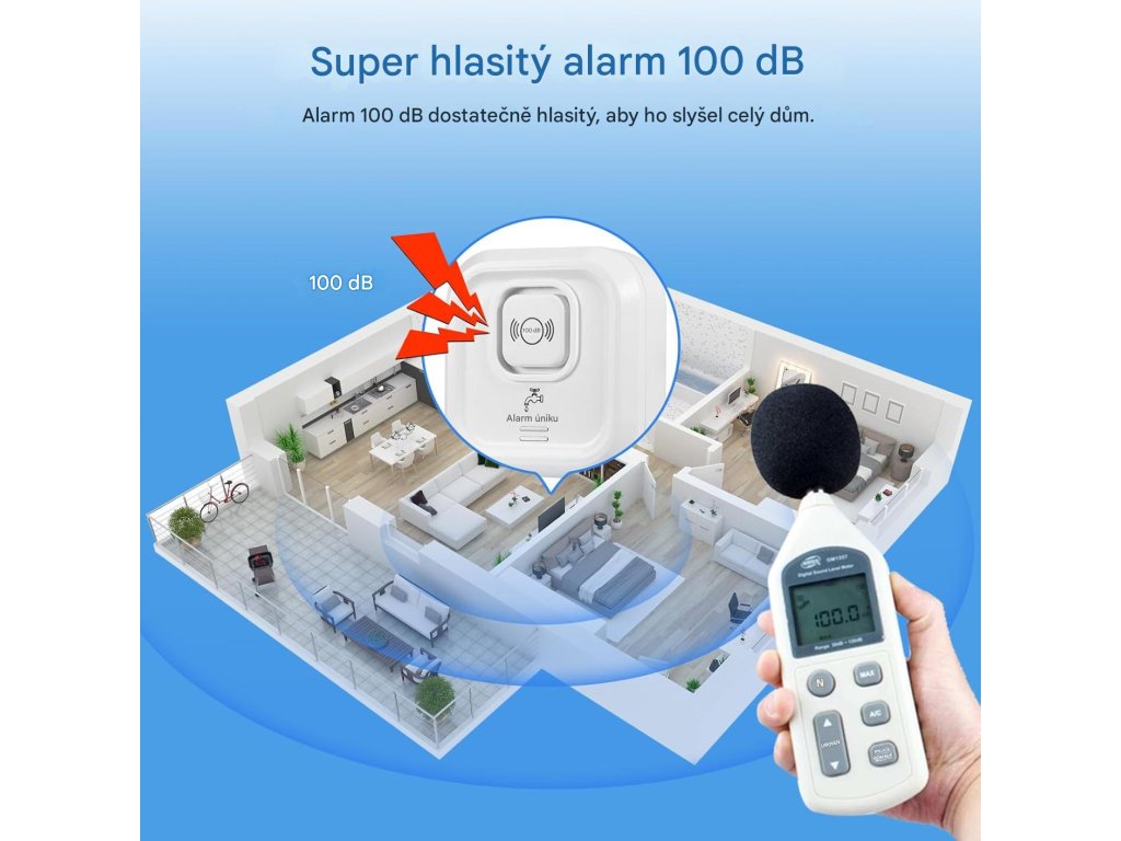 Při úniku nebo kapkách vody vydává vodní hlásič po dobu 60 sekund nepřetržitý 100dB tón.