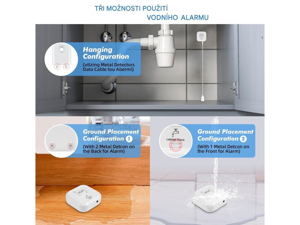 Rozšířená funkce 3v1. Tento přístroj je vybaven horním senzorem, dvěma spodními senzory a dlouhým detektorem a nabízí detekci úniku vody i stoupající hladiny vody.