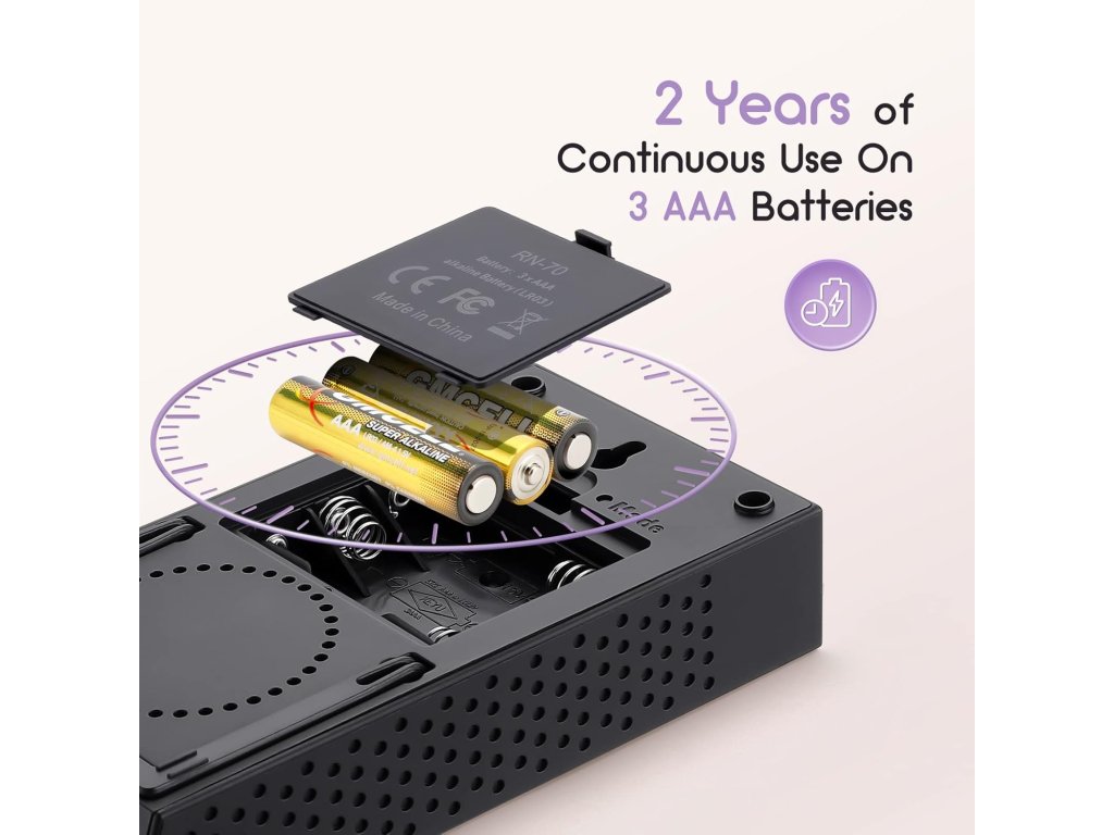 Detektor radonu je na baterie a funguje nepřetržitě až 2 roky na 3 AAA baterie, které jsou součástí dodávky.