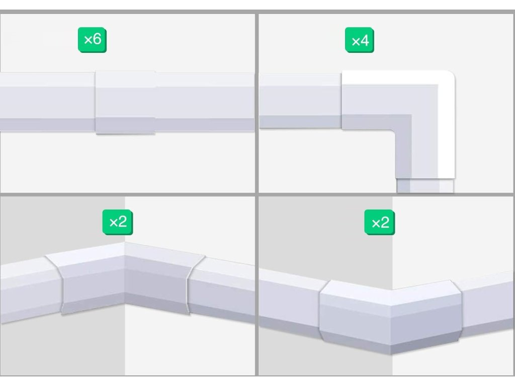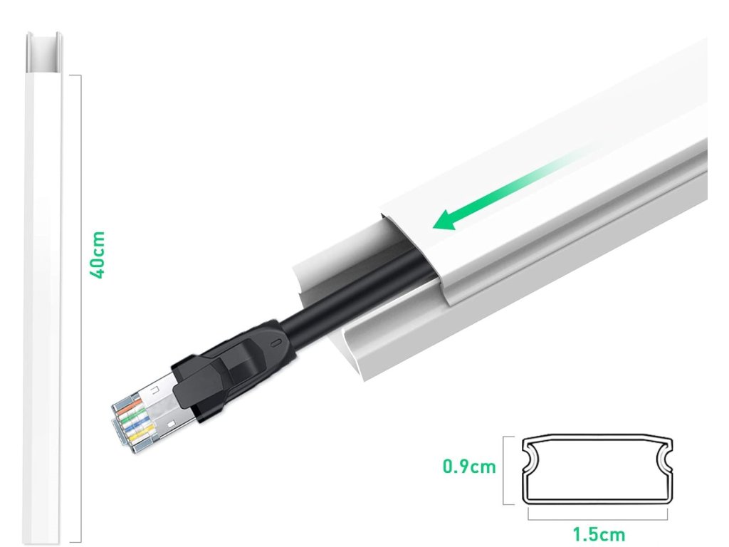 10 ks kabelových kanálů. Každý kanál: (D × Š × V) 40 × 1,5 × 0,9 cm. Celková délka 400 cm. 6 spojek, 4 ploché lokty, 2 vnitřní oblouky, 2 vnější oblouky, 1 oboustranná lepicí páska.