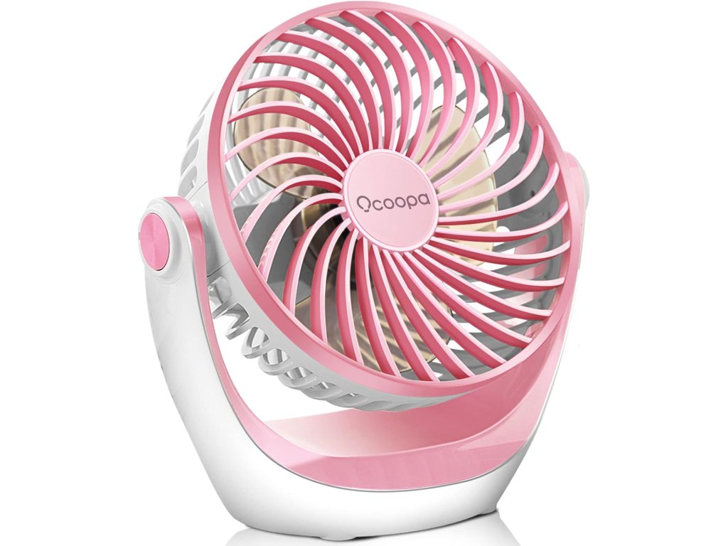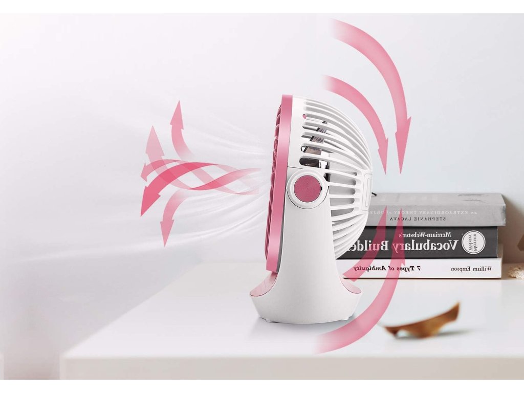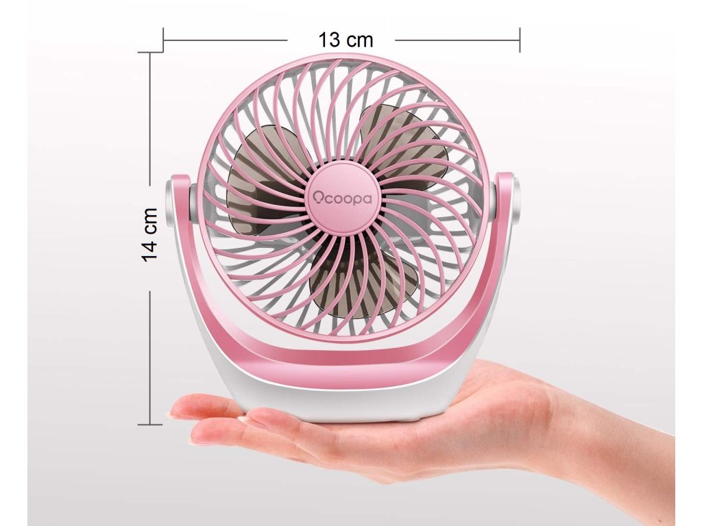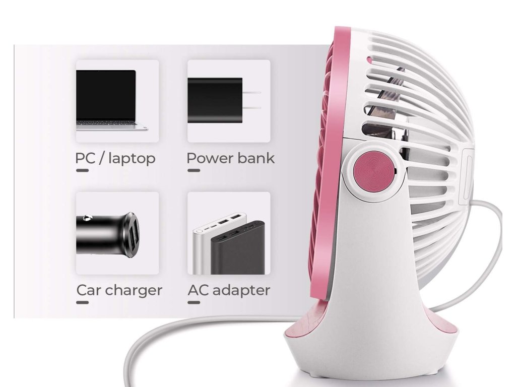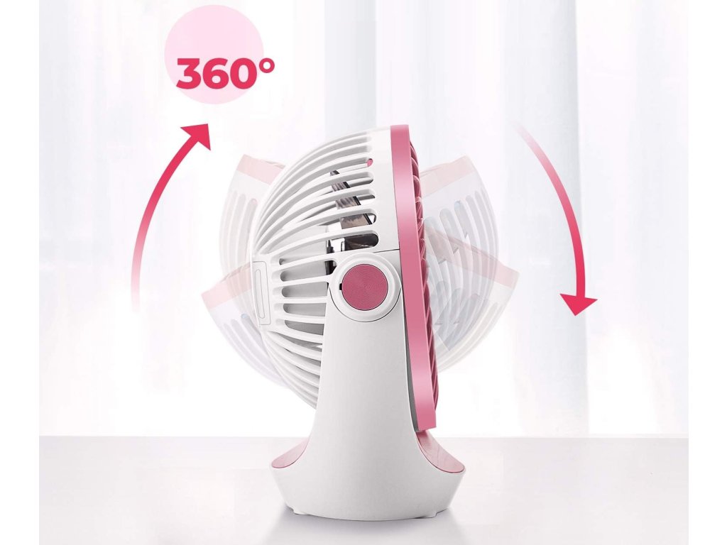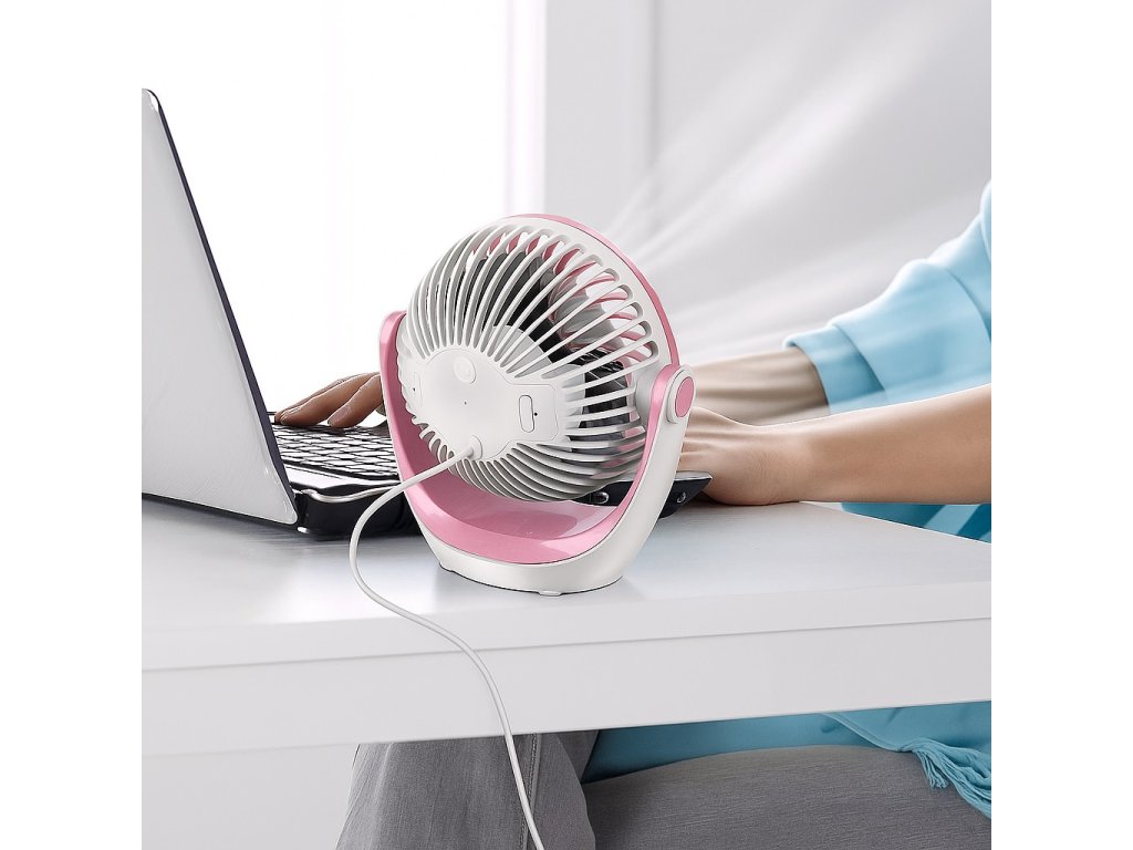 Malý stolní USB ventilátor s tichým provozem, 3 rychlosti, 360° otočná hlava, růžový