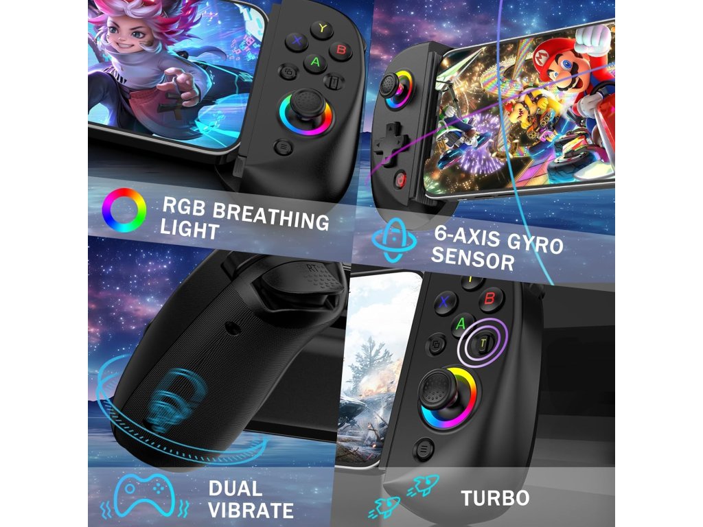 RGB světla; turbo; 6osý gyro (pro Switch/PS3/PS4/PC); vibrace (pro Switch/PS3/PS4/PC)