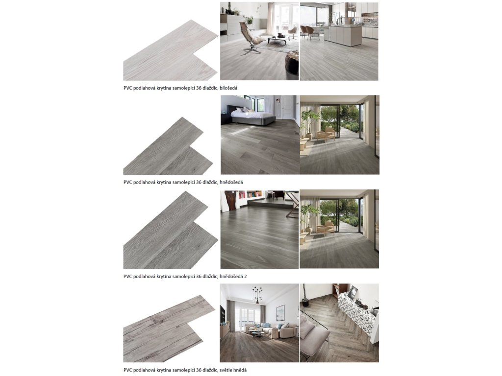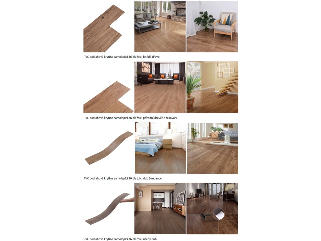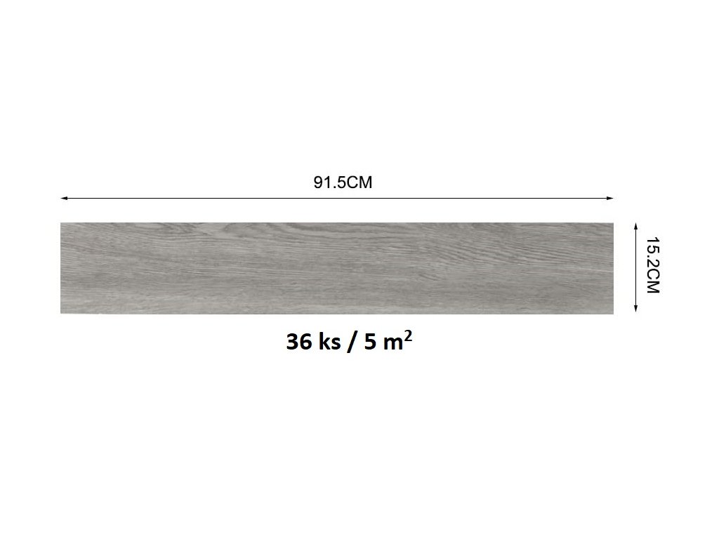 1 balení lepicí vinylové podlahy obsahuje 36 dlaždic o velikosti 91,5 cm x 15,2 cm (D x Š) a tloušťce 2 mm.