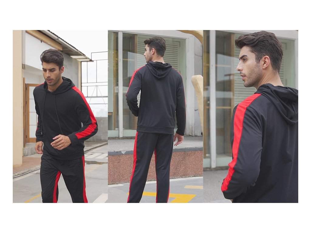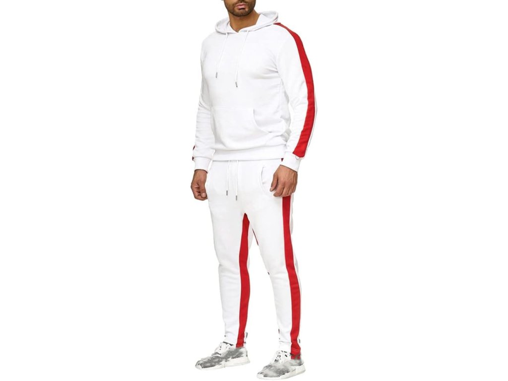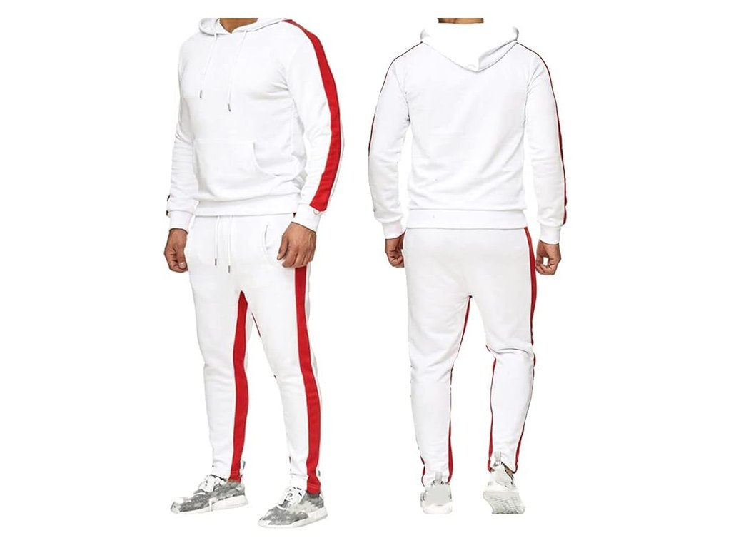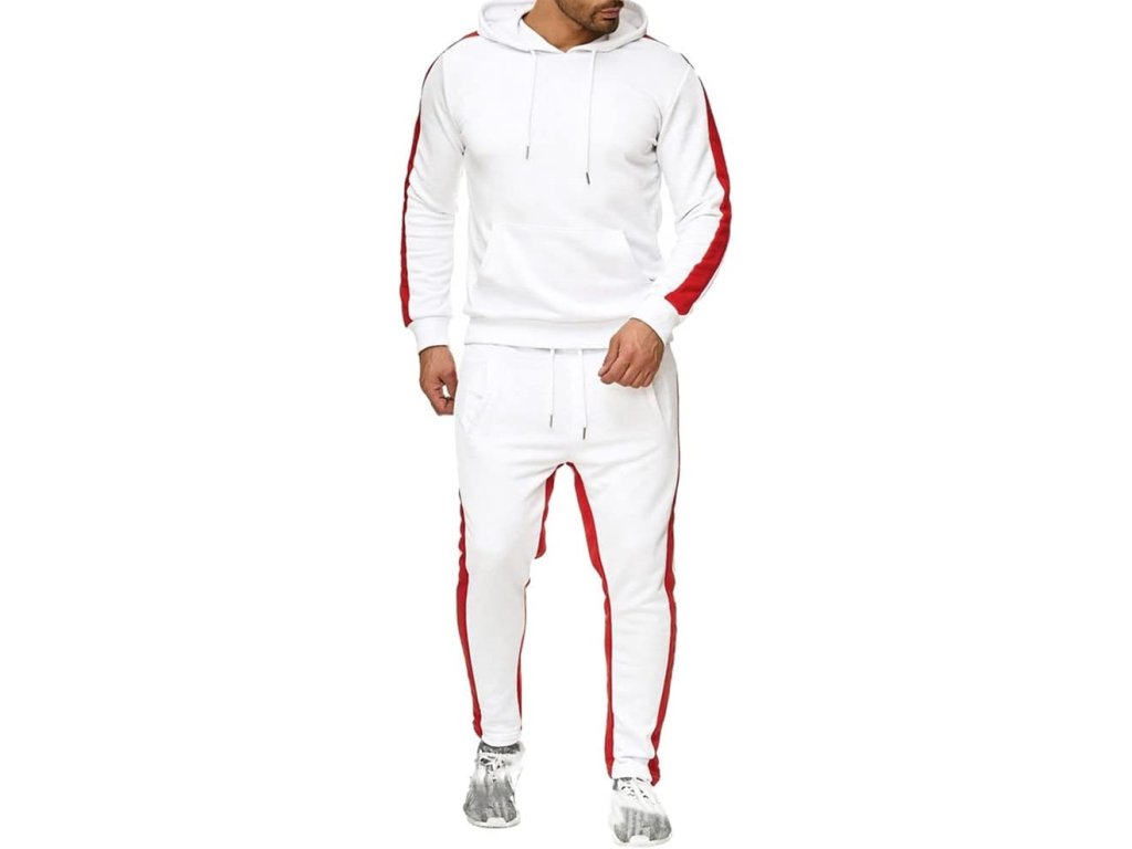 Pánská dvoudílná tepláková souprava obsahuje strečový top s kapucí a kalhoty, top s dlouhým rukávem a velkou přední kapsou a kalhoty s vysokým pasem a úzkým střihem.