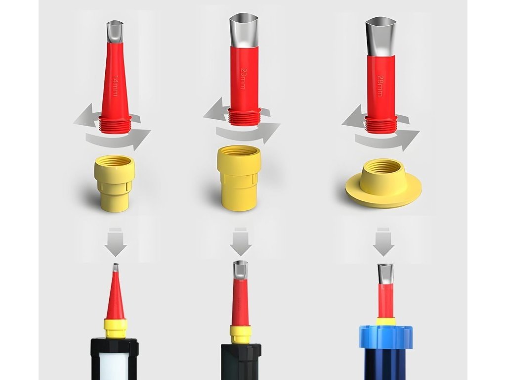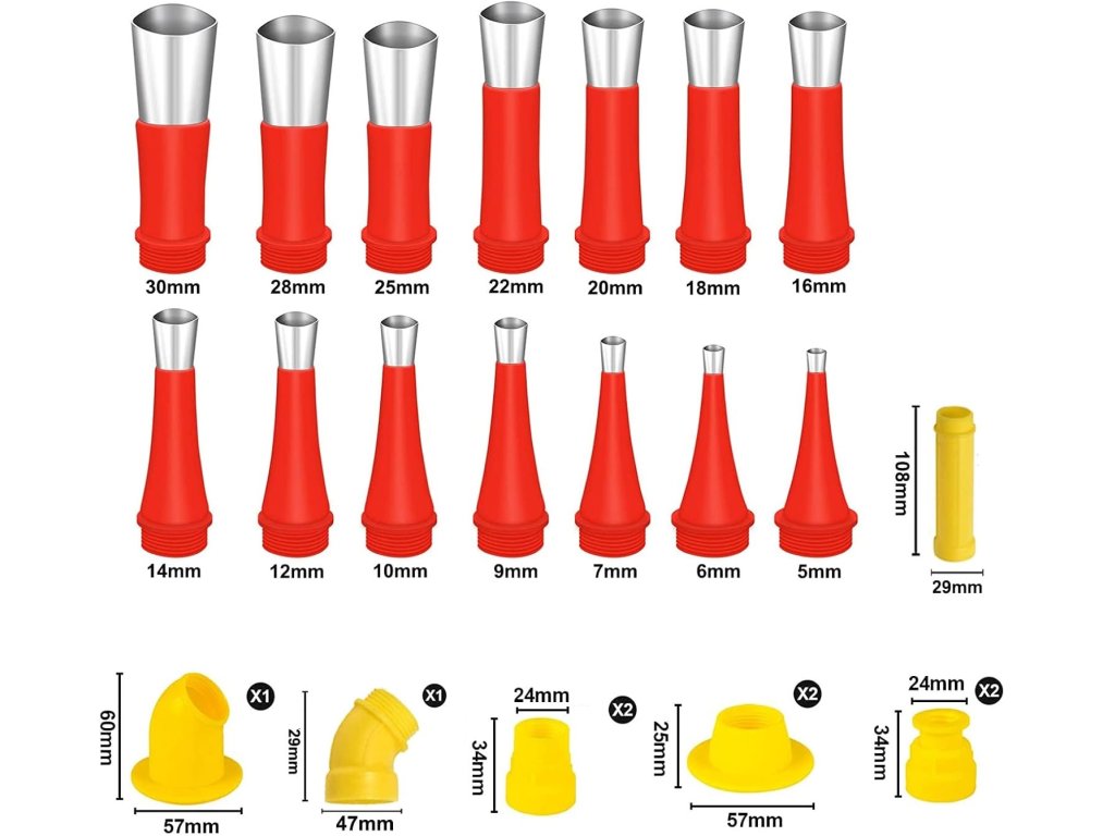 Trysky různých velikostí: 5 / 6 / 7 / 9 / 10 / 12 / 14 / 15 / 16 / 18 / 20 / 22 / 25 / 28 / 30 mm s připojovacím podstavcem pro snadné upevnění.
