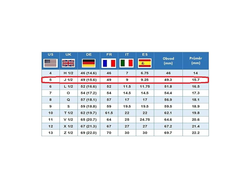 Prsten z ušlechtilé oceli velikost 5, což odpovídá průměru 15,7 mm a obvodu 49,3 mm.