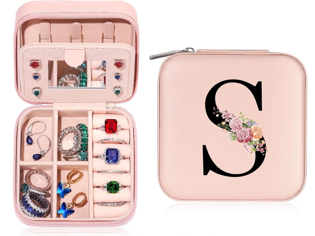 Personalizovaná dívčí mini šperkovnice s iniciálami "S" a květinami, cestovní, růžová