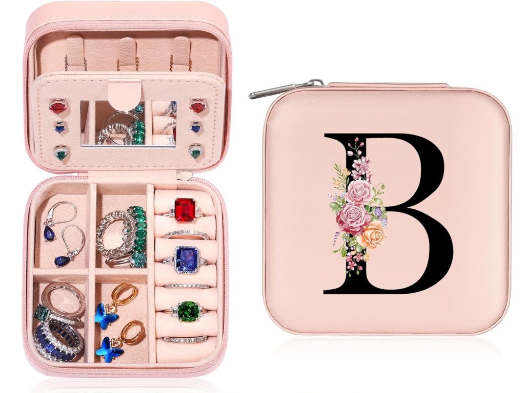 Personalizovaná dívčí mini šperkovnice s iniciálami "B" a květinami, cestovní, růžová