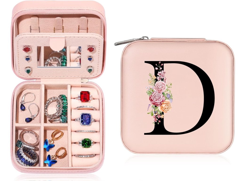 Personalizovaná dívčí mini šperkovnice s iniciálami "D" a květinami, cestovní, růžová