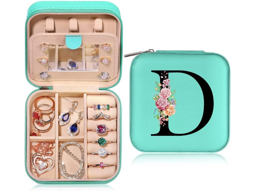 Personalizovaná dívčí mini šperkovnice s iniciálami "D" a květinami, cestovní, tyrkysová
