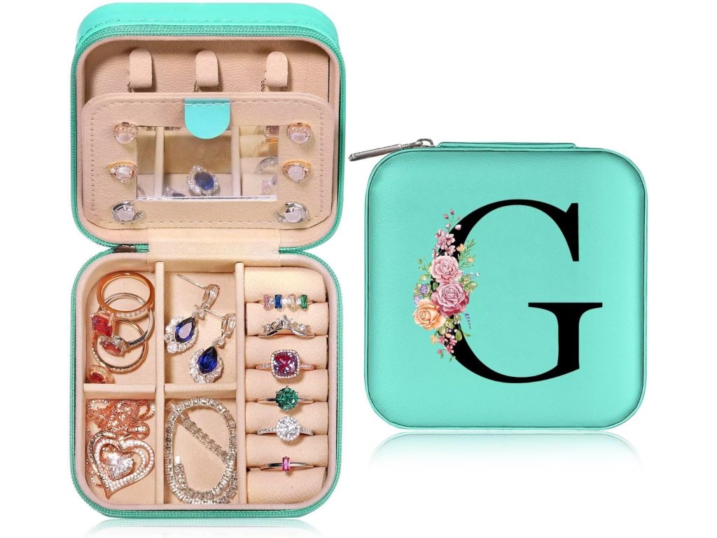 Personalizovaná dívčí mini šperkovnice s iniciálami "G" a květinami, cestovní, tyrkysová
